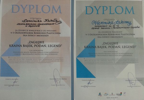 Kiedy w dzieciństwie babcie opowiadały nam zagłębiowskie legendy, słuchaliśmy z wypiekami na twarzy. Były dla nas żywe i prawdziwe. Niestety później wydorośleliśmy. W Stowarzyszeniu Promocji Kultury Zagłębia doszliśmy do wniosku, że legendy są częścią kultury i nie można o nich zapomnieć. A kto jak nie dziecko będzie ich największym entuzjastą? Przytoczony tekst, znajdziemy na dyplomach naszych uczennic biorących udział w I Ogólnopolskim Konkursie Plastycznym "Zagłębie kraina bajek, podań, legend". Rysunki wykonane pastelami olejnymi, w kategorii klas IV- VI, zdobyły nagrody i zostały zakwalifikowane do ogólnopolskiej wystawy.