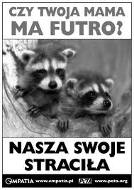 Pamiętaj, aby uszyć jedno futro przeciętnej wielkości zabija się 27 szopów, 40 soboli, 150 gronostai, 11 rysi, 18 lisów, 55 dzikich norek, 100 szynszyli lub 100 wiewiórek. Pomyśl o tym następnym razem, kiedy będziesz przechodzić obok sklepu futrzarskiego!