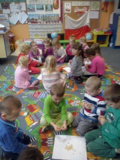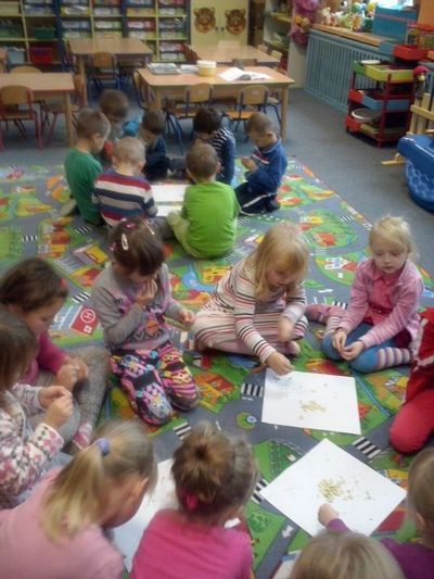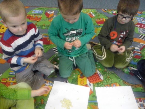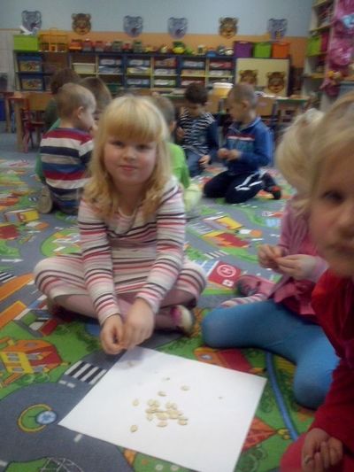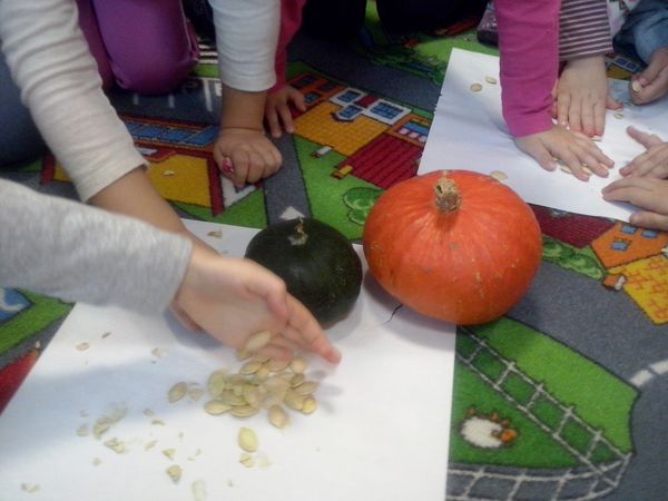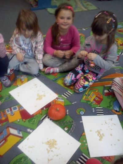 Kilka dni później dynia halloweenowa została rozkrojona. Dzieci wspólnie z wychowawczynią dokładnie wydobyły pestki dyni, po to aby je starannie ułożyć na papierowych tacach, a następnie zasuszyć. Gdy już pestki dyni były gotowe do spożycia, przedszkolaki z radością urządziły ucztę podczas której mogły zapoznać się ze smakiem nasion dyni oraz ich walorami zdrowotnymi.