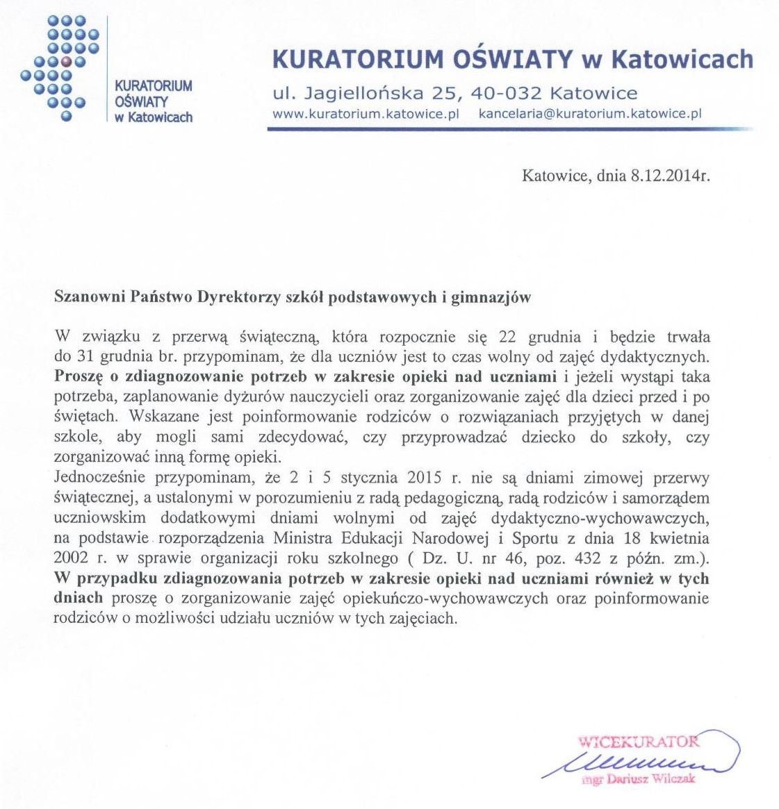 Informuję, że w czasie ferii świątecznych szkoła jest otwarta dla wszystkich dzieci, które będą potrzebowały opieki lub będą chciały te dni spędzić w szkole.