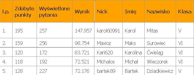Gratulujemy wszystkim uczniom ze szkoły, którzy postanowili zmierzyć się w wirtualnym świecie ze swoją wiedzą. Zapraszamy za rok do kolejnej edycji. Oto lista zwycięzców szkolnego etapu.