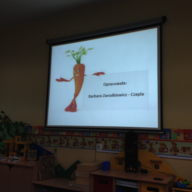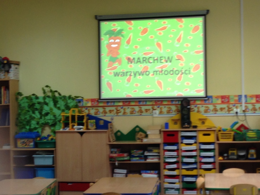 Najpierw obejrzeliśmy prezentację multimedialną przygotowana przez p. Basię pt.: „Marchewka – warzywo młodości”. Z prezentacji dowiedzieliśmy się, że spożywanie marchewki ma bardzo duży wpływ na nasze zdrowie i urodę. Jakie było nasze zdziwienie, kiedy dowiedzieliśmy się, że marchewka może mieć różne kolory: od bieli przez żółcie, czerwienie, po ciemny fiolet.