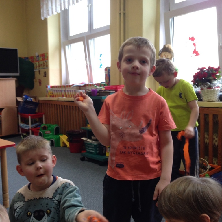 Na koniec naszych zajęć zrobiliśmy własne marchewki z woreczków foliowych, bibuły i papieru.