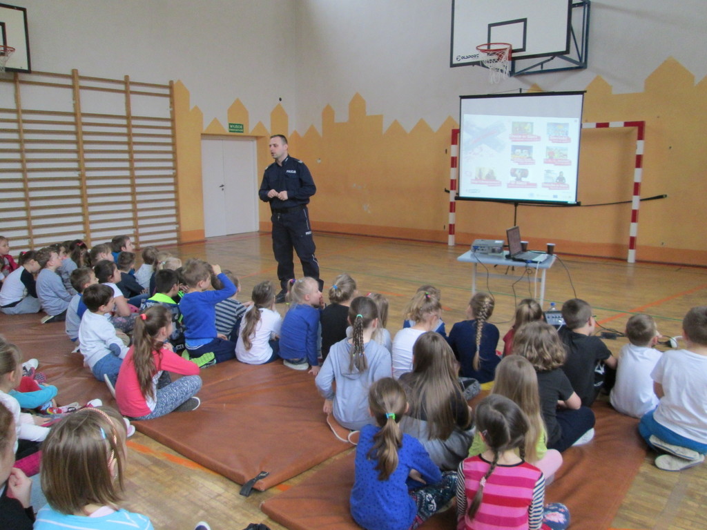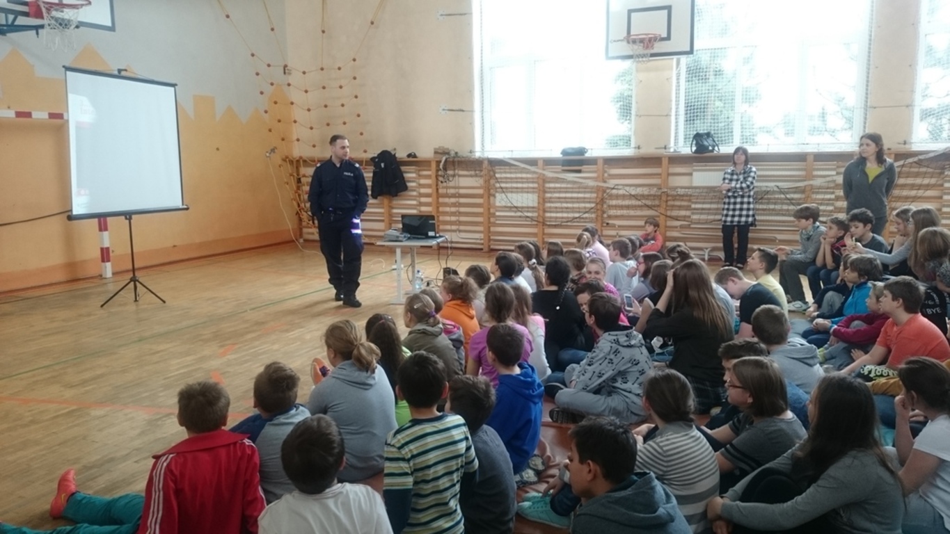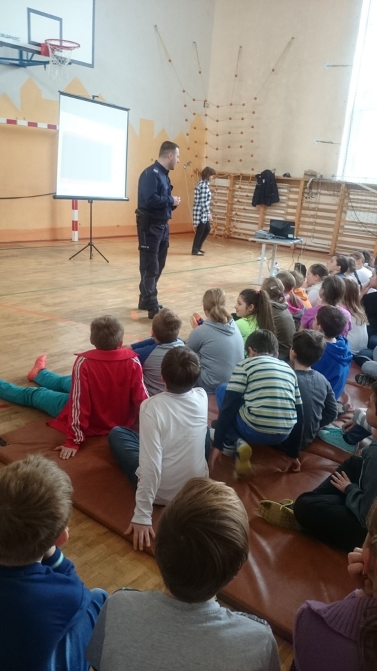 W poniedziałek, dnia 11 kwietnia, dzieci z klas I-III uczestniczyły w prelekcji przygotowanej przez policjanta z Komendy Powiatowej Policji w Będzinie. Tematyka związana była z niebezpieczeństwami wypływajacymi z nieumiejętnego posługiwania się Internetem. Temat okazał sie dzieciom na tyle bliskim, iż zadawały prowadzacemu wiele pytań. Dowiedziały sie także, że nie ma czegoś takiego jak anonimowość w sieci, oraz zostały pouczone o moożliwości ukarania (nawet przez sąd), jeśli umieściłyby w Internecie bez powolenia czyjeś zdjęcie, a pod nim oszczercze komentarze. Z radością i uwagą ogladały, znane im już serie filmików:"Owce w sieci".