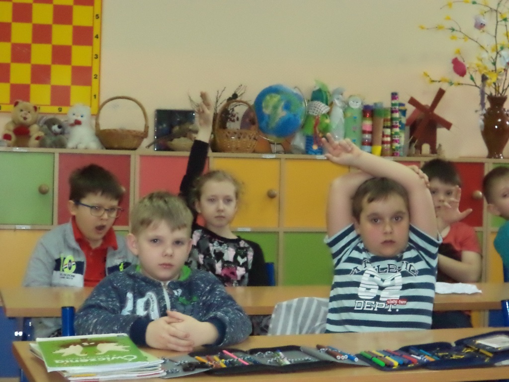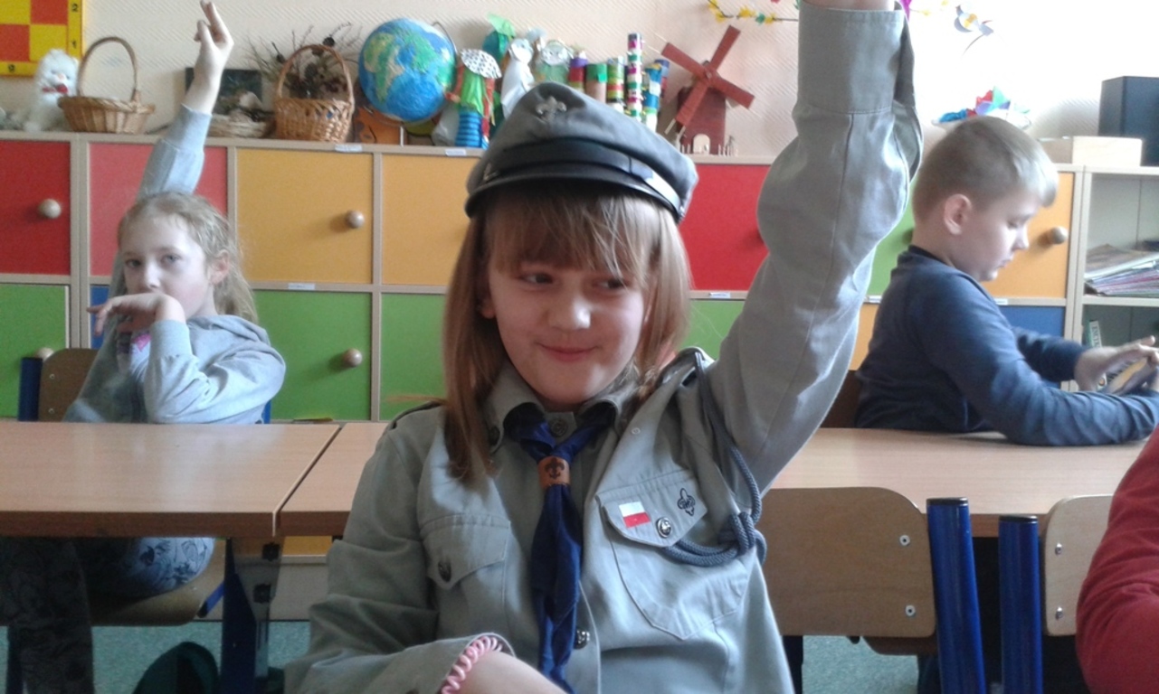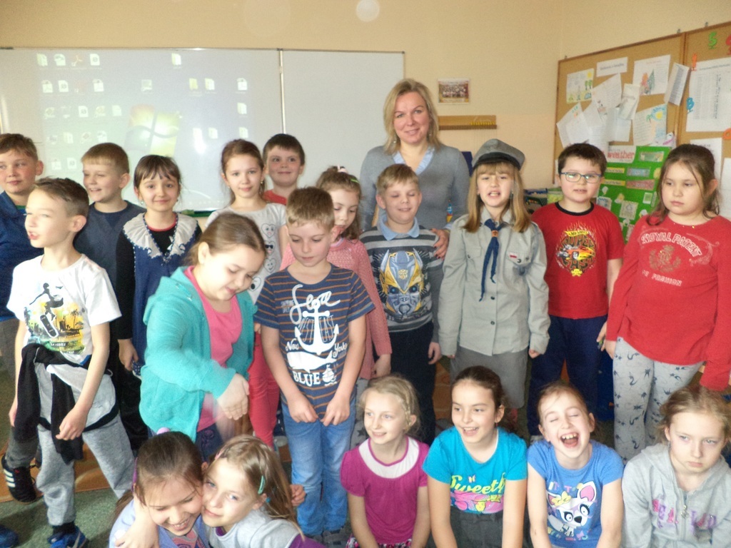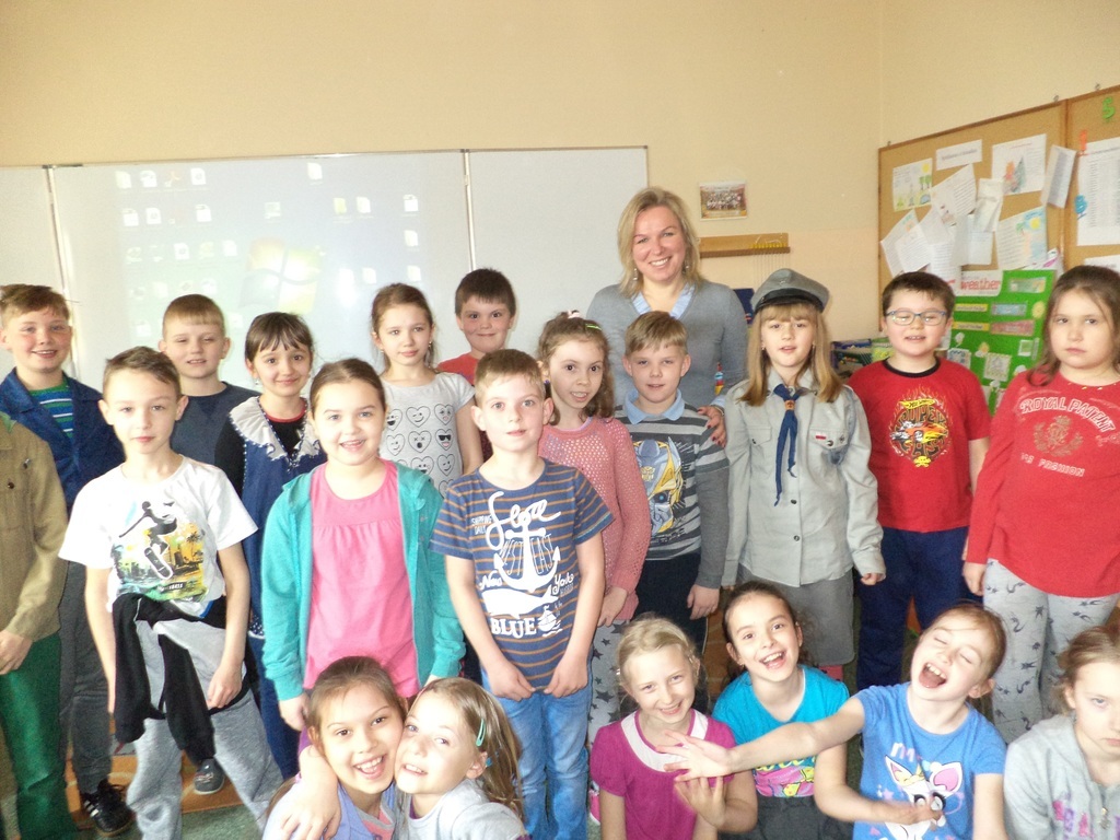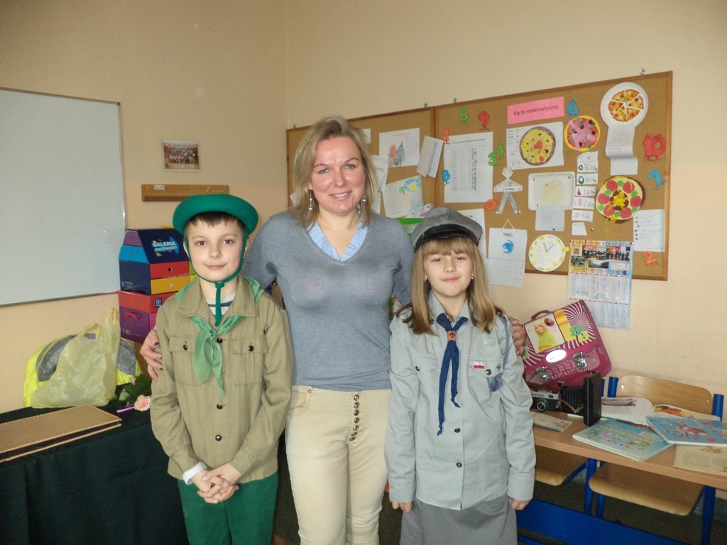 Duże wrażenie zrobiły na dzieciach mundurki uczniowskie oraz mundurek harcerski i zuchowy. Życie harcerzy i ich zwyczaje bardzo podobały się dzieciom. Na spotkaniu była również okazja do zabaw, które przetrwały przez kilka pokoleń do naszych czasów, skeczy oraz piosenek. Zaskoczeniem dla gości było odśpiewanie przez drugoklasistów dawnego hymnu szkoły, który napisała Pani Stanisława Kałuża. Pani Ola przygotowała dla dzieci zagadkę. Miały one rozpoznać na zdjęciu nauczyciela pracującego w naszej szkole w latach 80 – tych i obecnie. Mimo, że zadanie było trudne dwaj uczniowie: Mikołaj Czapla i Szymon Lazar rozpoznali na fotografii panią Barbarę Zarobkiewicz – Czaplę.