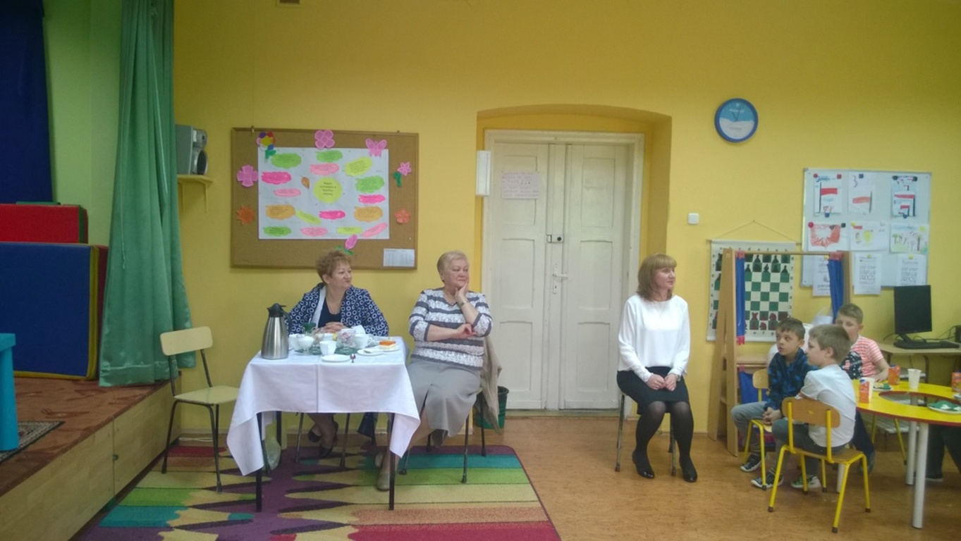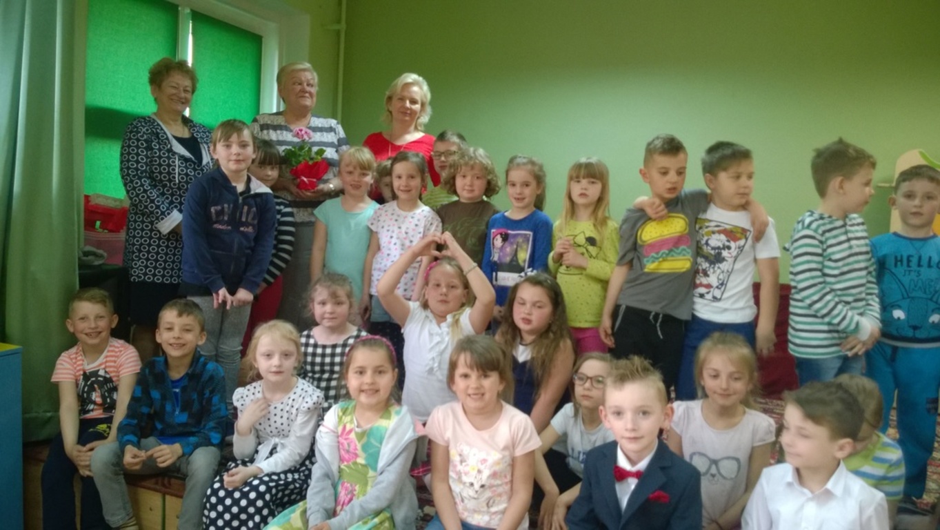 Trzecie spotkanie było spotkaniem integracyjnym obydwu klas pierwszych. Dzieci przygotowały wspólnie krótki występ o tematyce szkolnej i poczęstunek. Następnie zasiadły do stolików, by posłuchać wywiadu z zaproszonymi gośćmi. Na zaproszenie uczniów klasy Ia i Ib oraz wychowawczyń przybyły do szkoły Panie, które wiele lat poświęciły wychowaniu kolejnych pokoleń, głównie Sączowian- Pani dyrektor Elżbieta Sapińska, która pracowała w naszej szkole najpierw jako nauczyciel, później przez wiele lat pełniła funkcję dyrektora szkoły oraz Pani Stanisława Kałuża, która przez wiele lat była nauczycielem w naszej szkole. Pani dyrektor Elżbieta Sapińska opowiedziała o pierwotnym wyglądzie szkoły i o zmianach jakie nastąpiły w czasach, kiedy była dyrektorem placówki. Wielką nowością była sala komputerowa, bez której dzieci obecnie nie wyobrażają sobie szkoły. Wtedy też powstał pierwszy plac zabaw, z którego do dziś korzystają uczniowie szkoły i przedszkolaki. Dzięki staraniom Pani Dyrektor, społeczności lokalnej i sponsorów naszej szkole nadano sztandar. Był to czas wielkich zmian w naszej szkole. Pani Stasia Kałuża wspominała szkołę z czasów, kiedy sama była uczennicą. Z tych czasów utkwiła jej w pamięci postać kierownika szkoły- Pana Zygmunta Tajchmana. Z jego inicjatywy powstał piękny ogród, w którym obok drzew i krzewów owocowych posadzono drzewa morwowe. Były też poletka doświadczalne, na których dzieci szkolne pomagały uprawiać warzywa. Pani Stasia po latach wróciła do tej szkoły jako nauczyciel. Swoją pracę wykonywała z wielkim zamiłowaniem. Na dowód swoich opowieści przyniosła pamiątkowe zdjęcia. W dalszym ciągu zaproszone panie wspominały uczniów i nauczycieli, których pamiętały ze swoich czasów szkolnych, przytaczały anegdoty związane ze szkołą.
