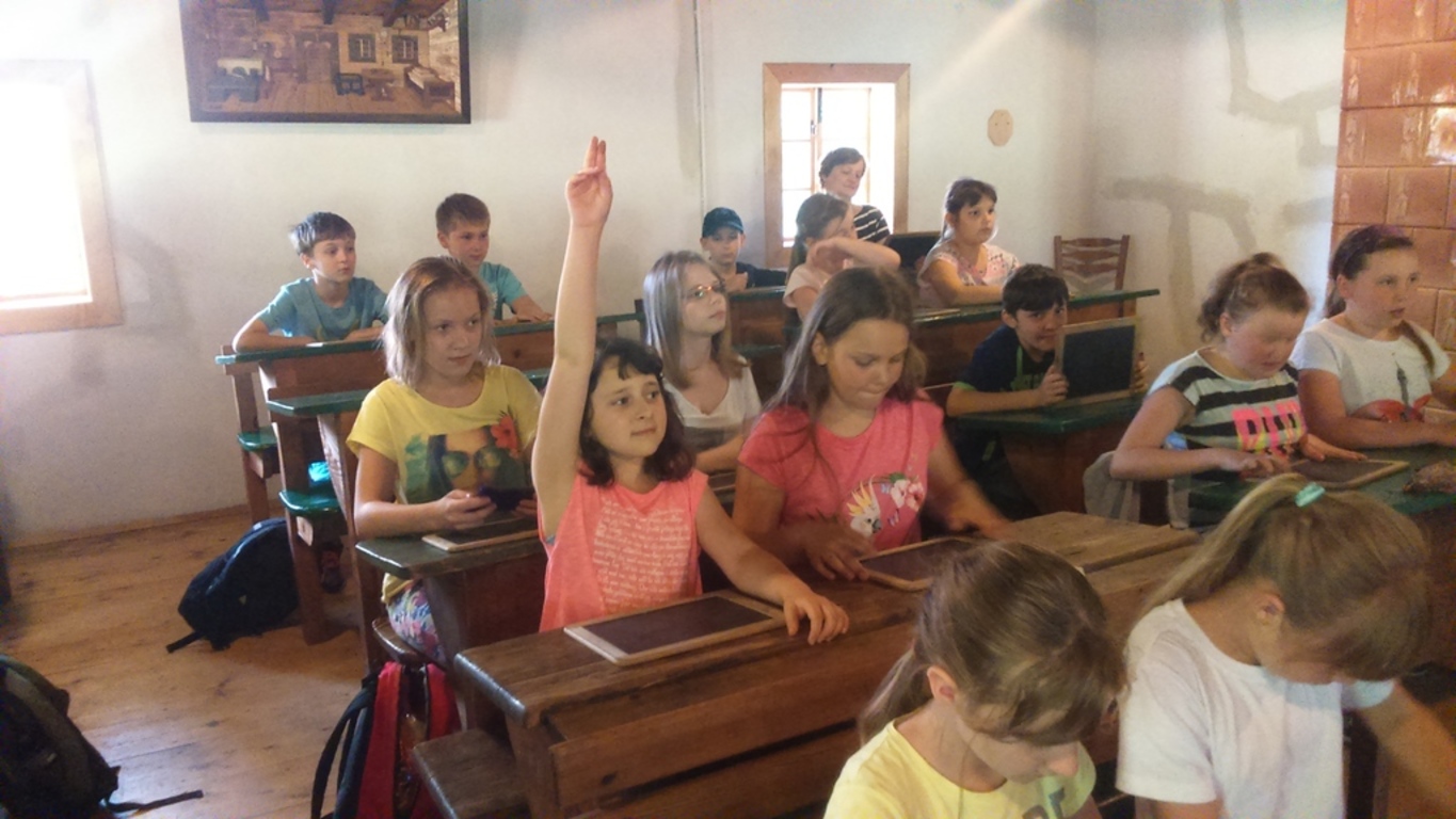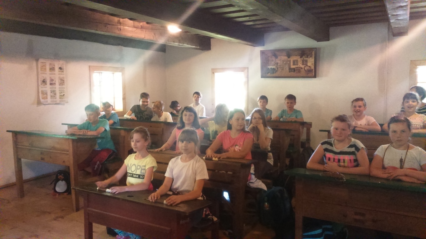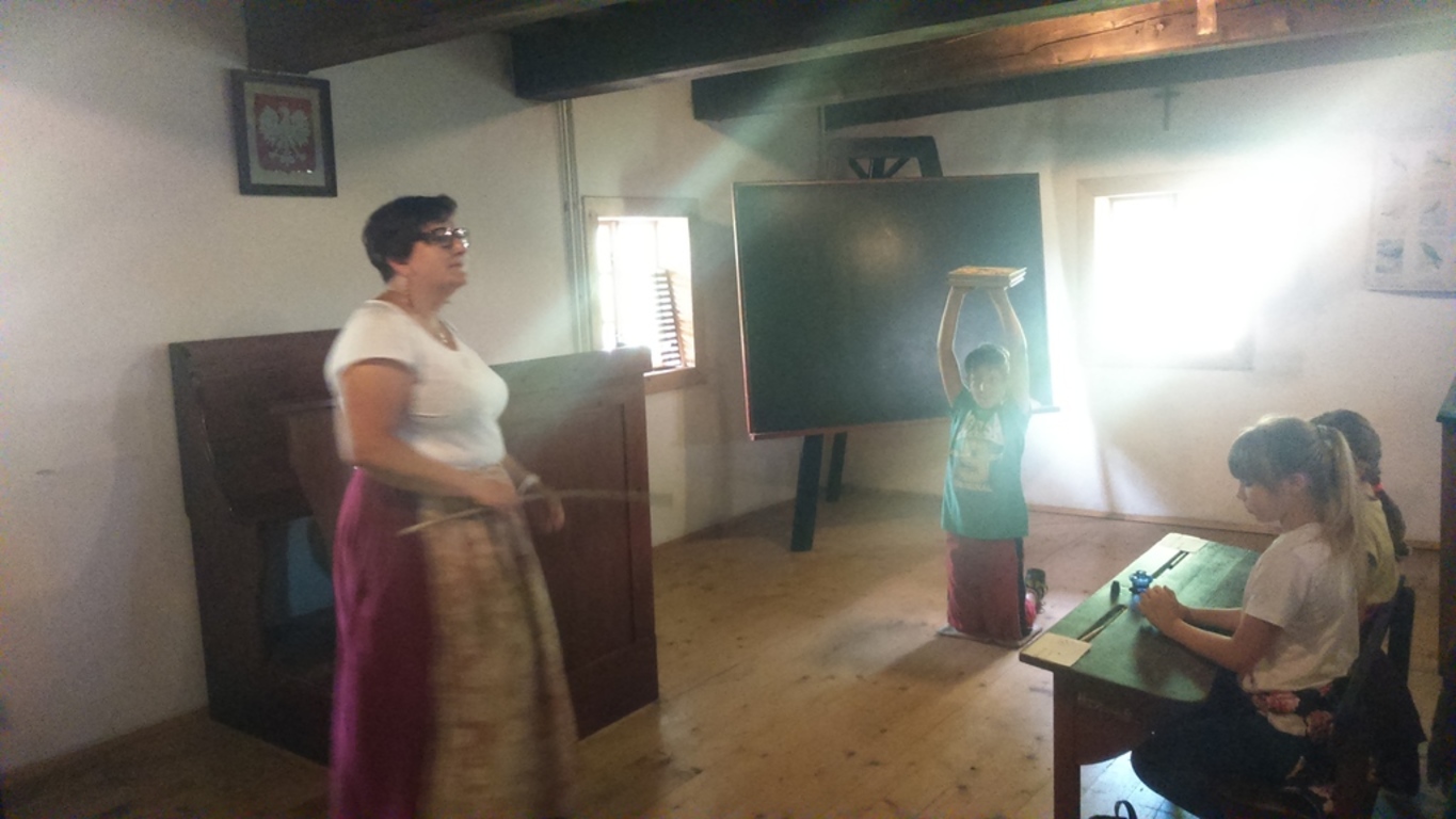Tegoroczny Dzień Dziecka spędziliśmy w Górnośląskim Parku Etnograficznym w Chorzowie, gdzie mieliśmy okazję zobaczyć wnętrza starych chat i zabudowań gospodarskich. Największą atrakcją pobytu w skansenie była niezapomniana lekcja w starej szkole, podczas której przenieśliśmy się do czasów szkolnych lat naszych dziadków i pradziadków. Siedząc w dawnych ławach, wcieliliśmy się w uczniów sprzed stu lat i na własnej skórze przekonaliśmy się, jak to dawniej w szkole było…