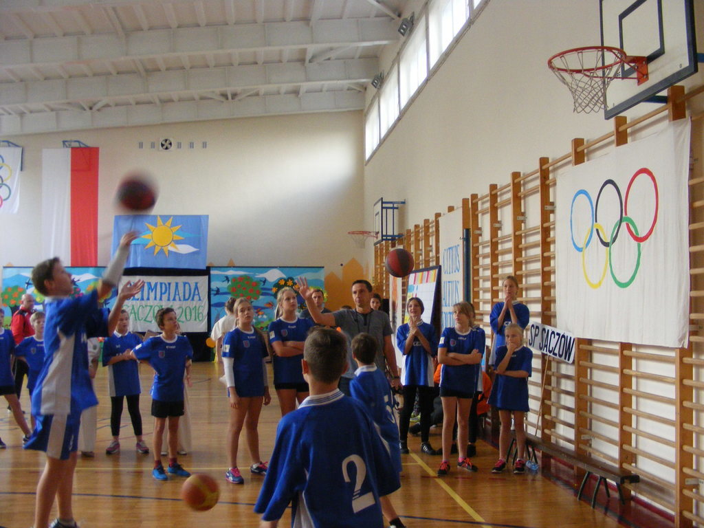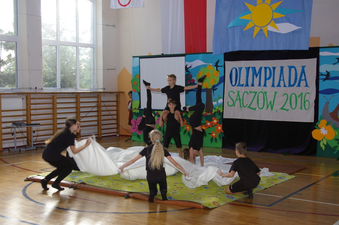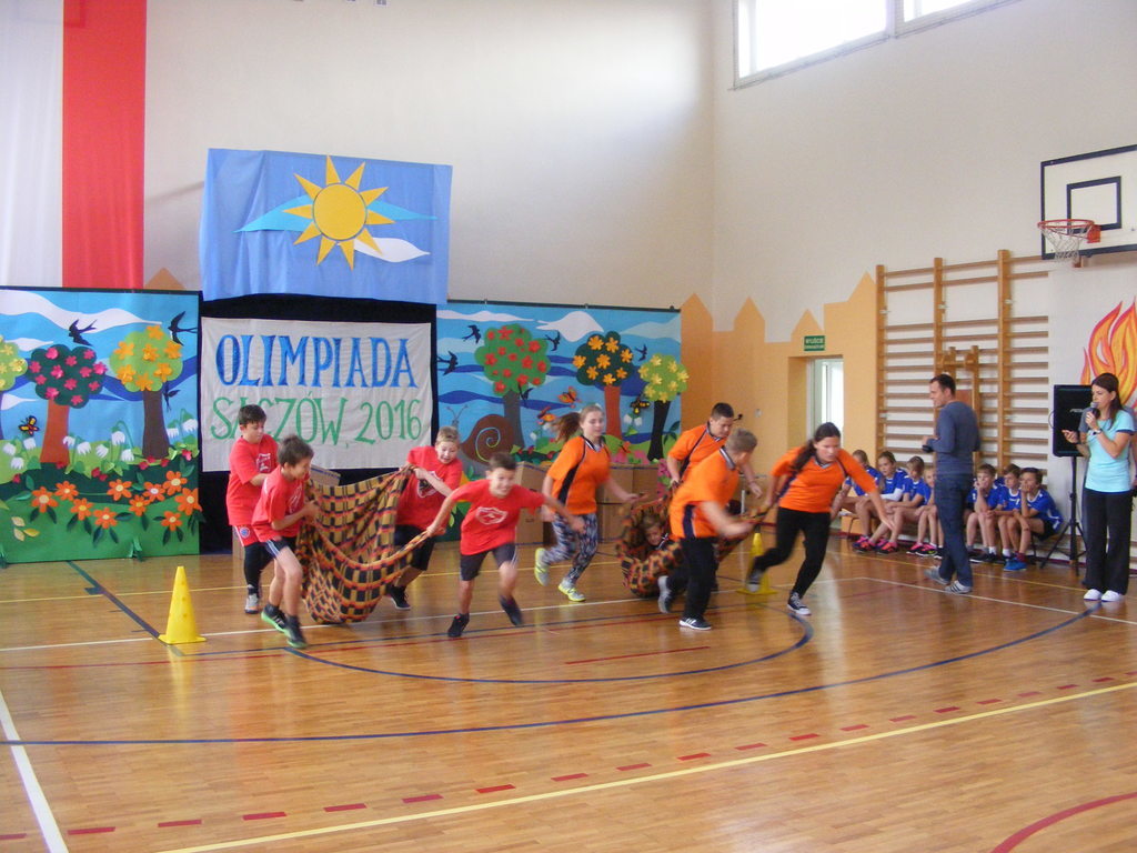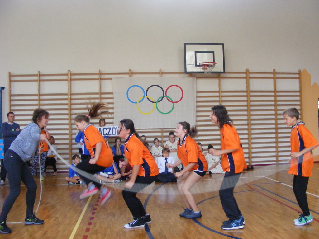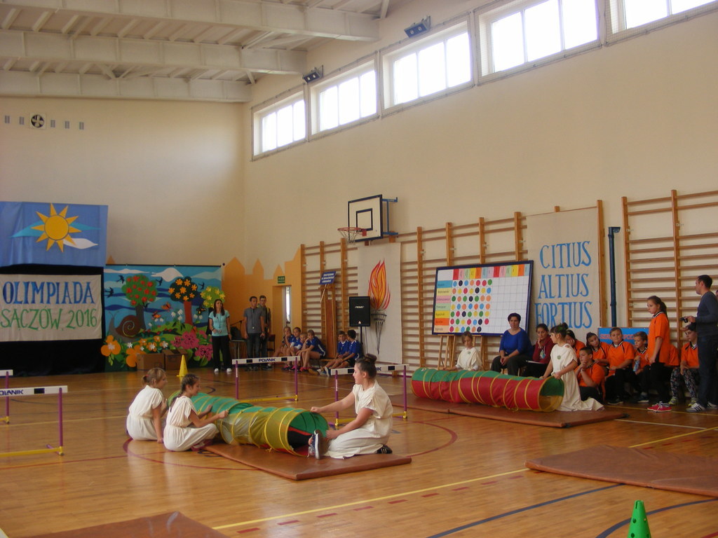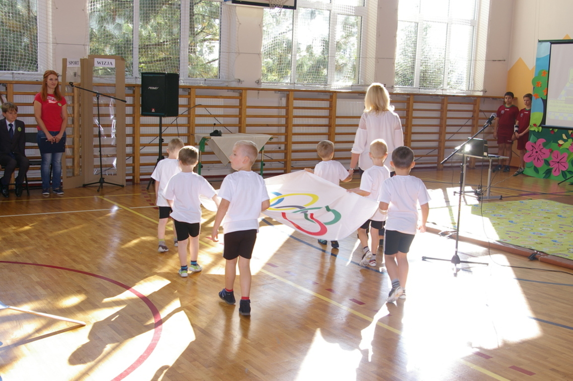 O godzinie 10.00 rozpoczęła się uroczysta ceremonia, podczas której miały miejsce: defilada z kołami olimpijskimi oraz wniesienie olimpijskiej flagi. Odbyło się także ślubowanie zawodników oraz pokazy gimnastyczne. Zwinne i skoczne pszczółki przyleciały prosto z przedszkola, a zatańczyły tak pięknie, że ściany oblała miodowa poświata słońca, a termometr poszybował w górę. Następnie giętkość swą zaprezentowali uczniowie piątej i szóstej klasy, którzy wykonali bardzo trudny choreograficznie układ wymyślony przez panią Ewę Klimczyk. Uroczystość uświetniło także wspólne odtańczenie belgijki oraz zapalenie znicza.