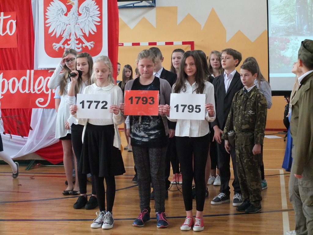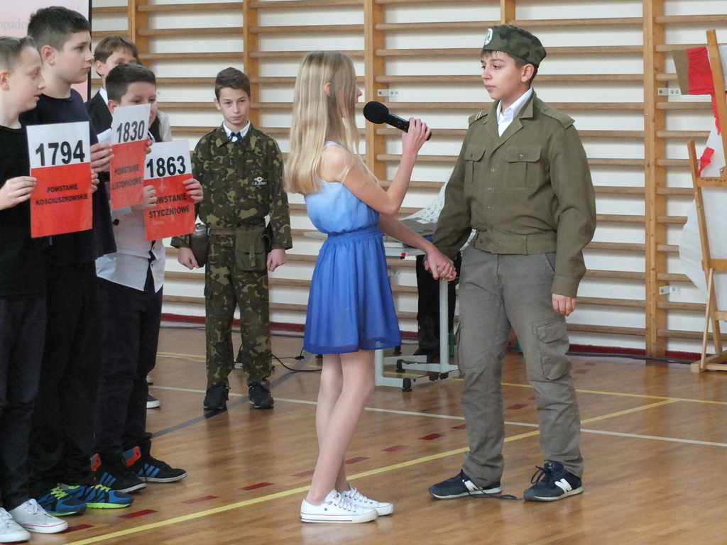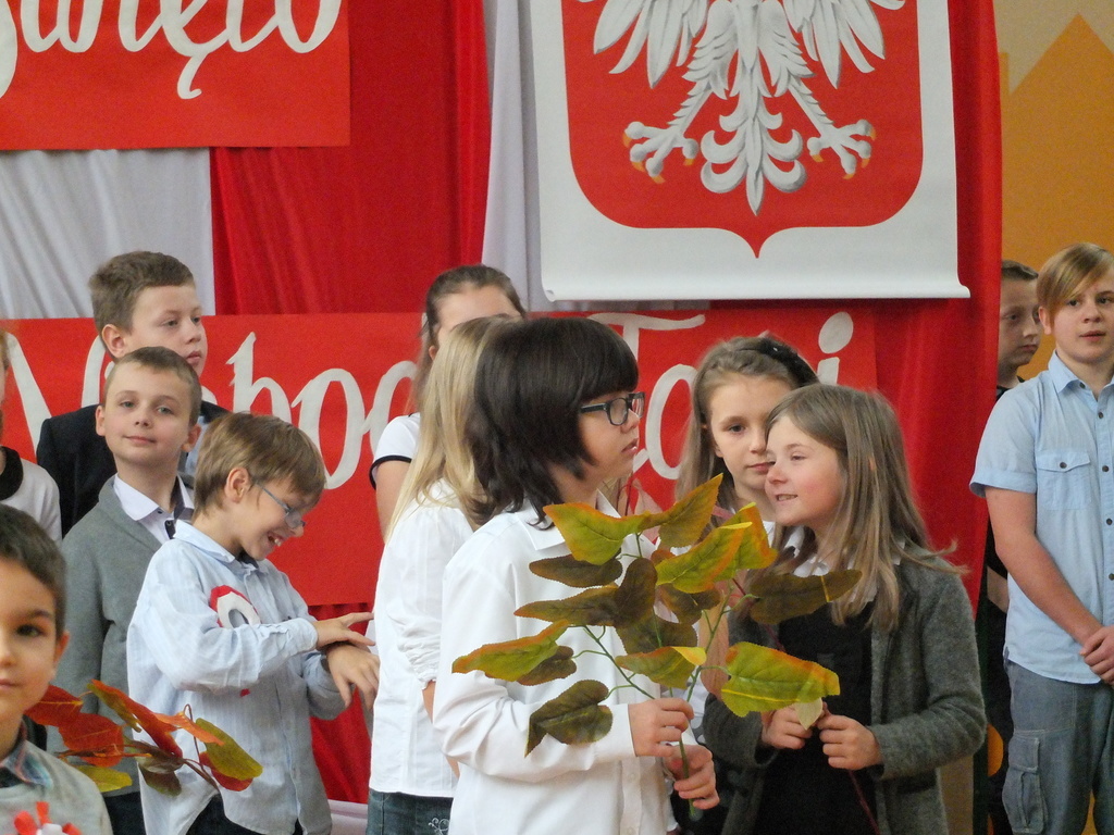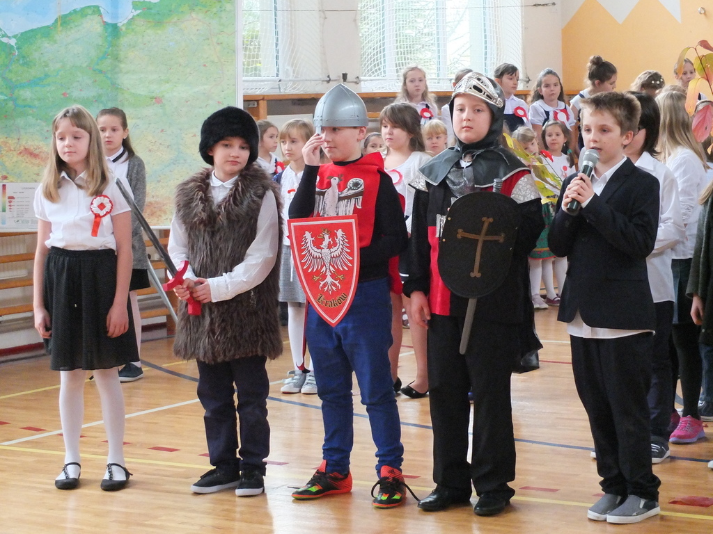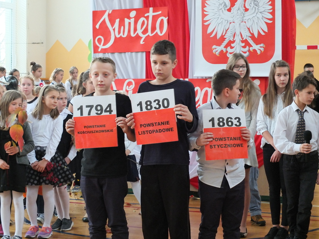 z klasy IV przypomnieli nam najpopularniejszą polską legendę o Lechu, Czechu i Rusie, która mówi o powstaniu naszego państwa. Starsi koledzy w scenkach pantomimicznych przypomnieli najważniejsze daty, w tym 1772, 1793 i 1795 rok, czyli lata, w których doszło do trzech rozbiorów Polski. Zobaczyliśmy też wzruszającą scenkę, gdzie polski żołnierz żegna się ze swą ukochaną, by ruszyć do boju o wolność ojczyzny.