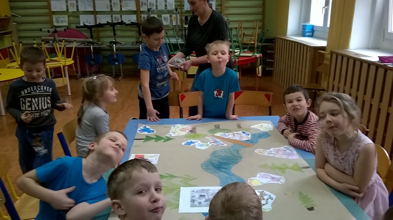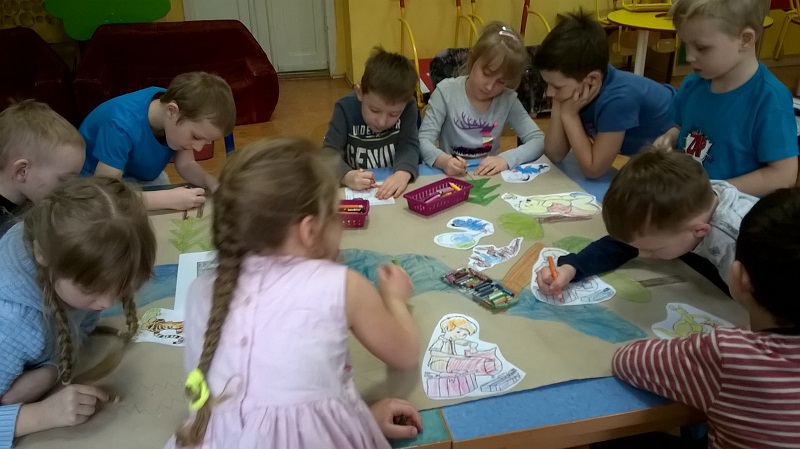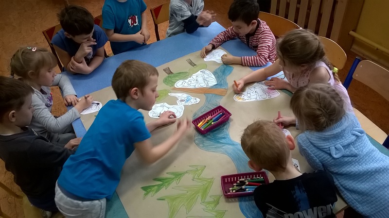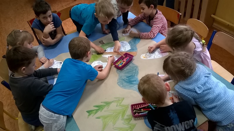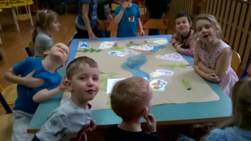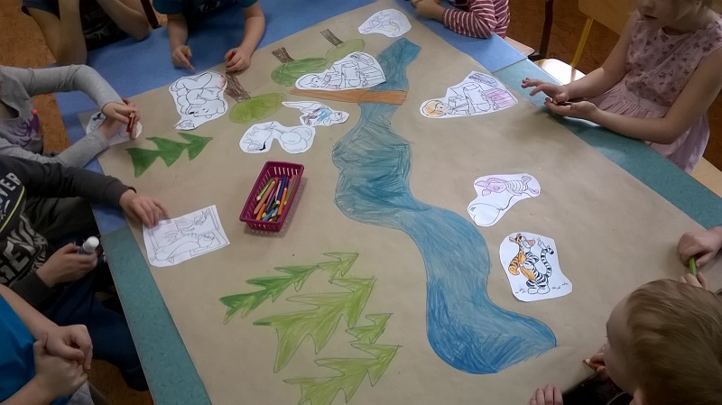 a przekazane treści na długo zapadną w ich pamięci. Dzieci współnie wykonały mapę Stumilowego Lasu, a w nagrodę za wspólną pracę „otrzymały małe co nieco”. Dzieciom dziękujemy za wspólną zabawę.