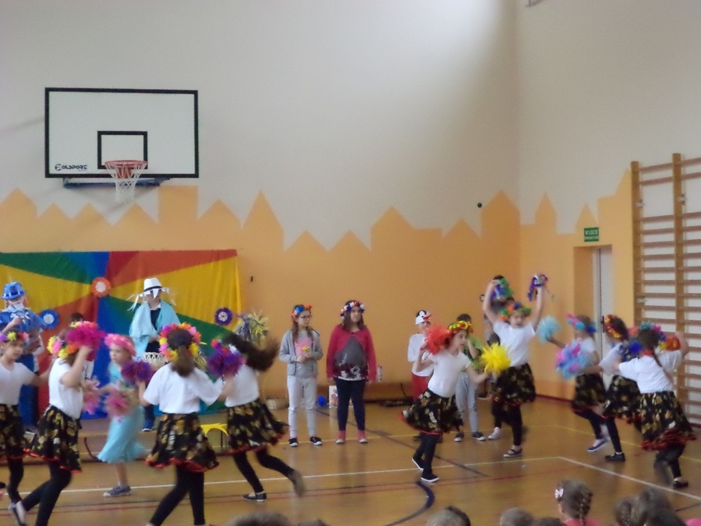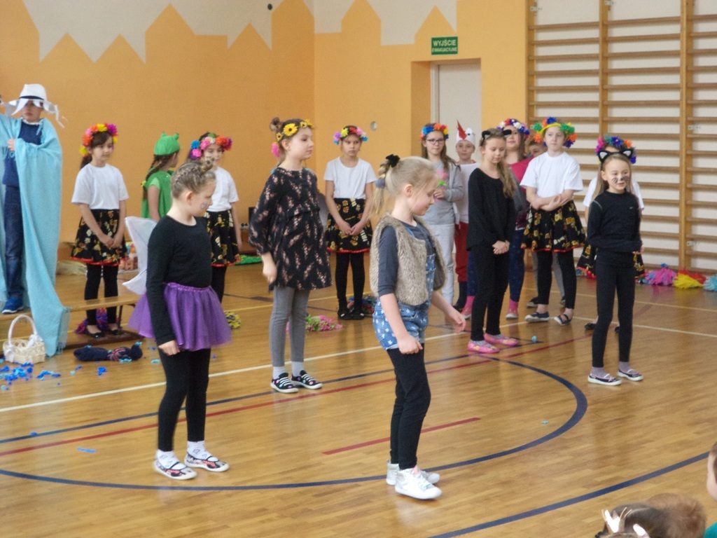 W dniu 20 marca – pierwszym dniu astronomicznej wiosny do naszej szkoły zawitała Wiosna, ubrana w błękitną sukienkę. W tym dniu w naszej szkole było kolorowo i wesoło. Uczniowie klas III przygotowali występy artystyczne, na które zaprosili wszystkich uczniów oraz przedszkolaków. Trzecioklasiści zapoznali zebranych z tradycjami związanymi z nadejściem wiosny – marzanną, gaikiem, gregoriankami, bocianami oraz wodą. Na sali gimnastycznej pojawiły się barwne postaci z wierszy i piosenek o tematyce wiosennej. Nie zabrakło również tańców. W tym dniu wszyscy dobrze się bawili.