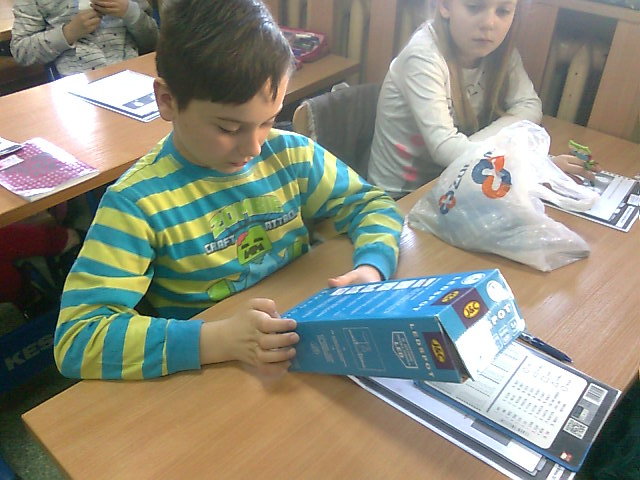 Po wypełnieniu zadania 1 z karty pracy nr 3 uczniowie pracowali w grupach. Dokładnie analizowali informacje zawarte na opakowaniach żarówek LED ze zwróceniem uwagi na ich barwę, czas świecenia.