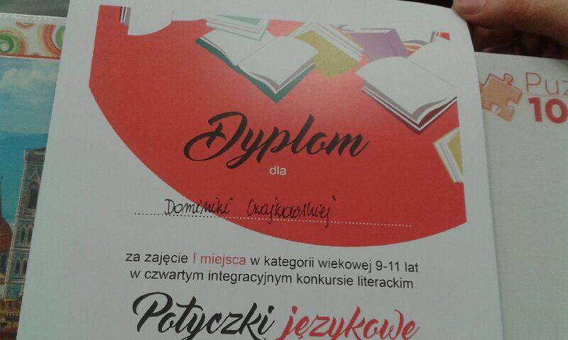 Dnia 17 maja 2017r. w Miejskiej i Powiatowej Bibliotece Publicznej w Będzinie, odbył się IV Integracyjny Konkurs Literacki "Potyczki językowe”, organizowany przez Powiatową Poradnię Psychologiczno-Pedagogiczną oraz Miejską i Powiatową Bibliotekę Publiczną w Będzinie. Naszą szkołę po raz kolejny reprezentowała uczennica klasy IV Dominika Czajkowska. I po raz kolejny Dominika zajęła I miejsce w tym powiatowym konkursie. Dominika w sposób wyjątkowy zaprezentowała wiersz „Arbuz” Jana Brzechwy. Jury, pan Starosta Arkadiusz Watoła, pani Dyrektor Powiatowej Poradni Psychologiczno-Pedagogicznej Jolanta Białas oraz dyrektor Miejskiej i Powiatowej Biblioteki Publicznej w Będzinie Krzysztof Malczewski byli oczarowani występem naszej uczennicy. Dominice serdecznie gratulujemy i jesteśmy pełni podziwu za zdolności recytatorskie, pamięć i dykcję.