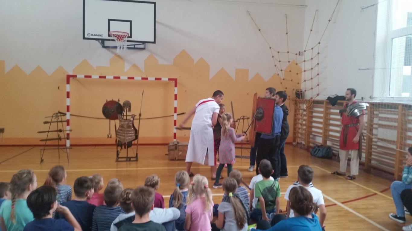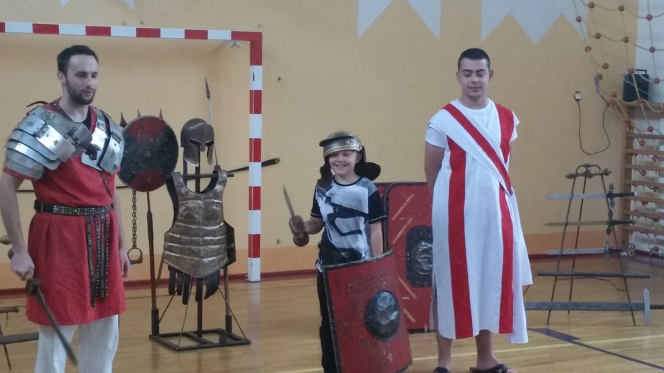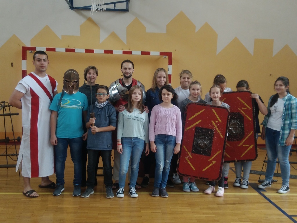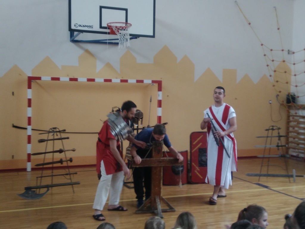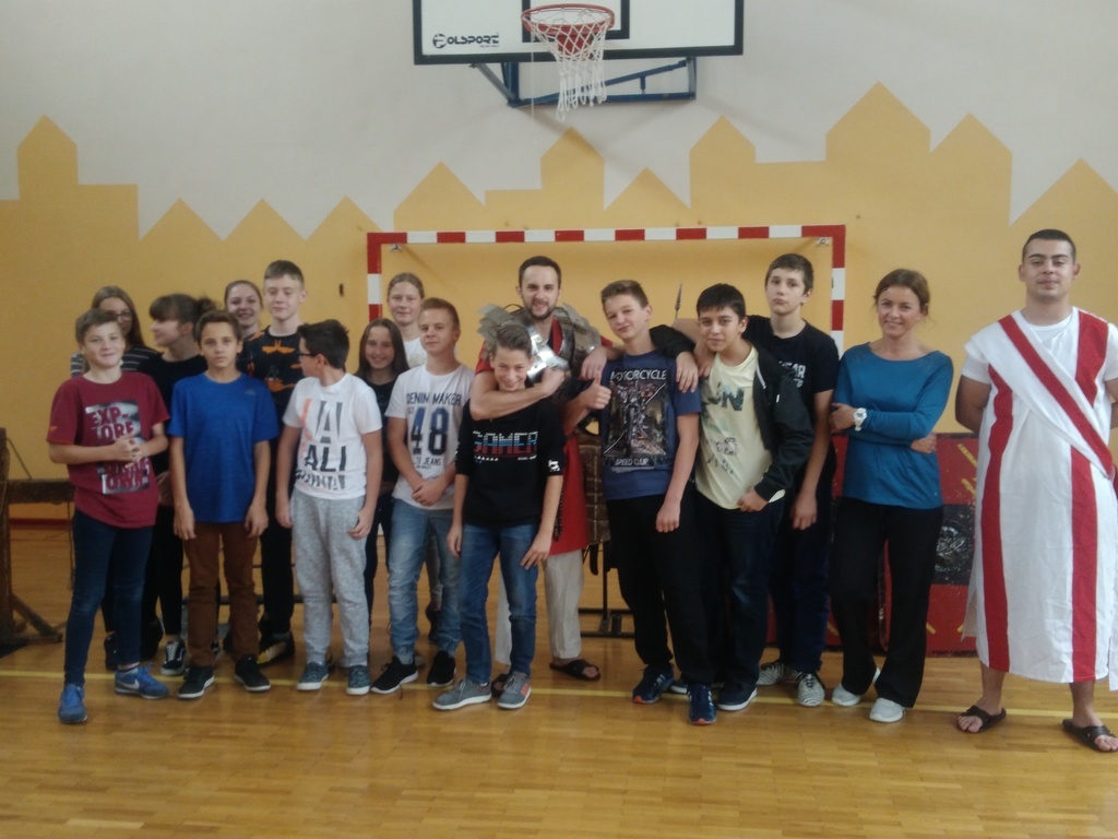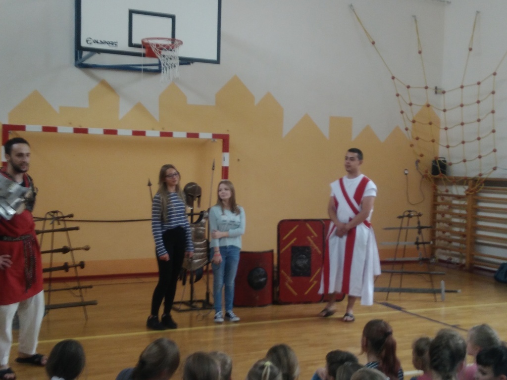W miniony czwartek uczniowie naszej szkoły uczestniczyli w nietypowej lekcji historii. Przyjechali do nas przedstawiciele grupy historycznej „Rekonstrukto” z Lublina i zabrali w niezwykłą podróż do przeszłości. A konkretnie do starożytnego Rzymu. Mogliśmy na własne oczy zobaczyć typowe rzymskie stroje, przedmioty codziennego użytku, uzbrojenie oraz… narzędzia tortur. Niektórzy z nas mogli przez chwilę stać się rzymskimi legionistami, a inni barbarzyńcami. Dwie z naszych koleżanek zostały zapięte w gruby, żelazny łańcuch i na krótką chwilę stały się….niewolnicami. Mogliśmy też, oczywiście fikcyjnie, zdecydować o życiu lub śmierci naszego kolegi. Takie właśnie prawo panowało w starożytnym państwie rzymskim.