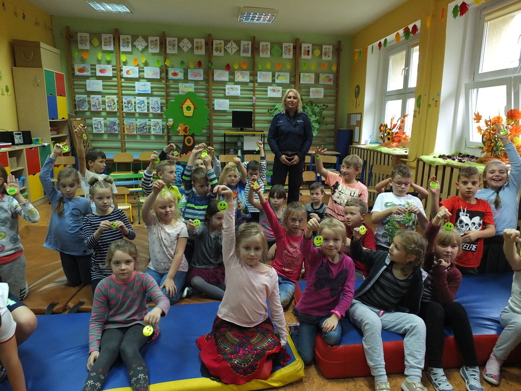 Pani policjantka przypomniała o przepisach dotyczących odblasków. Każdy pieszy poruszający się po drodze zobowiązany jest do ich noszenia. Szczególną uwagę zwrócono na to, jak niezwykle ważna jest widoczność pieszego i rowerzysty na jezdni.