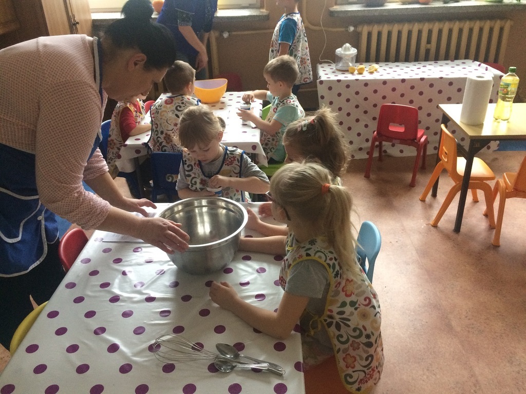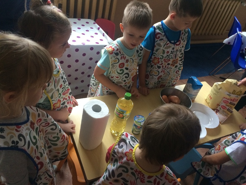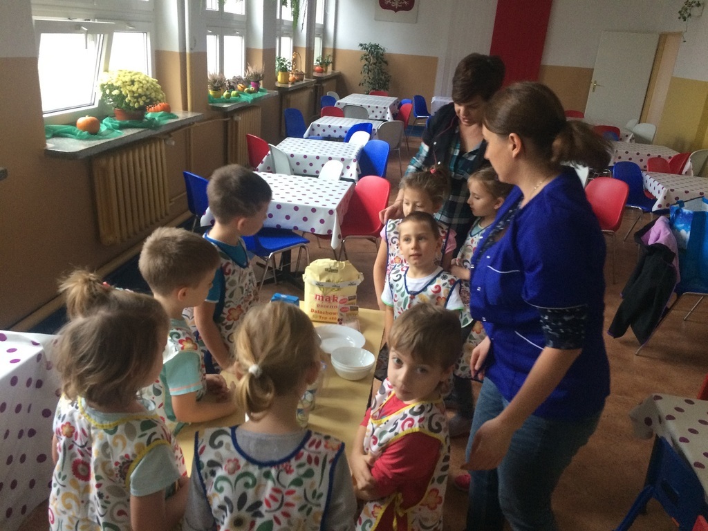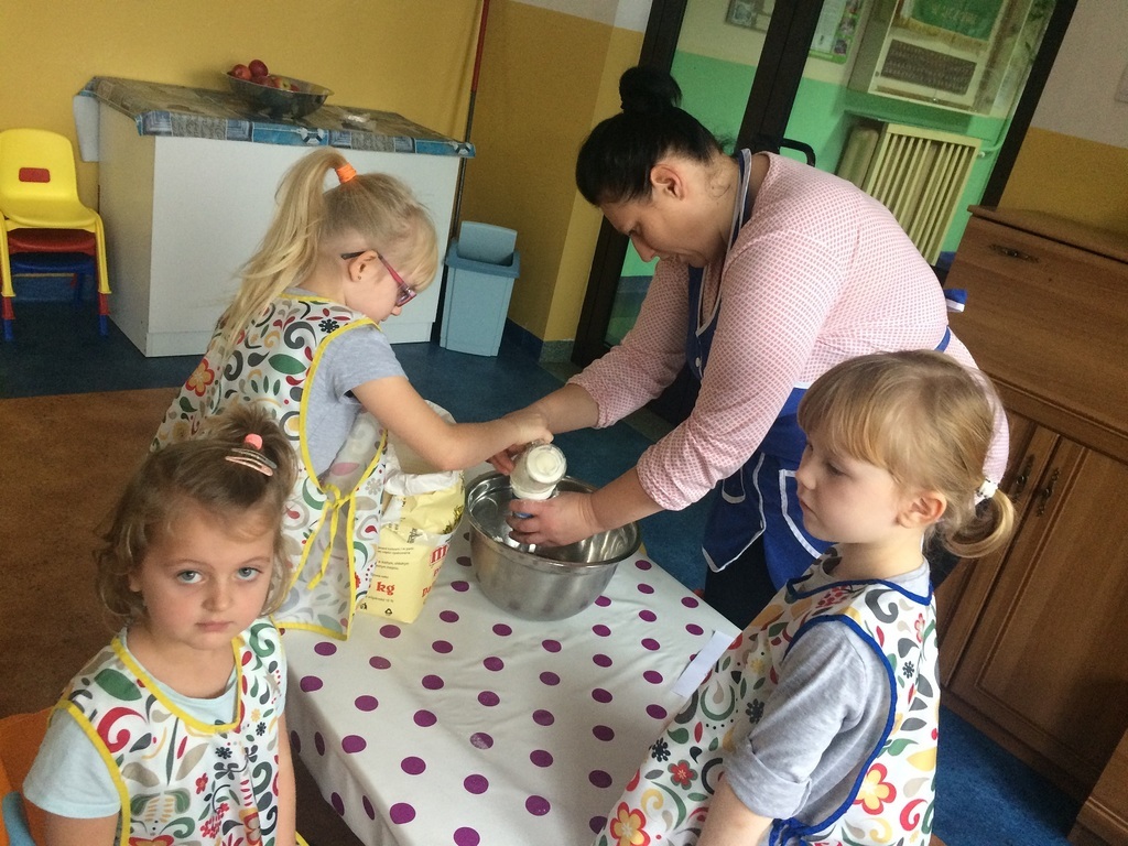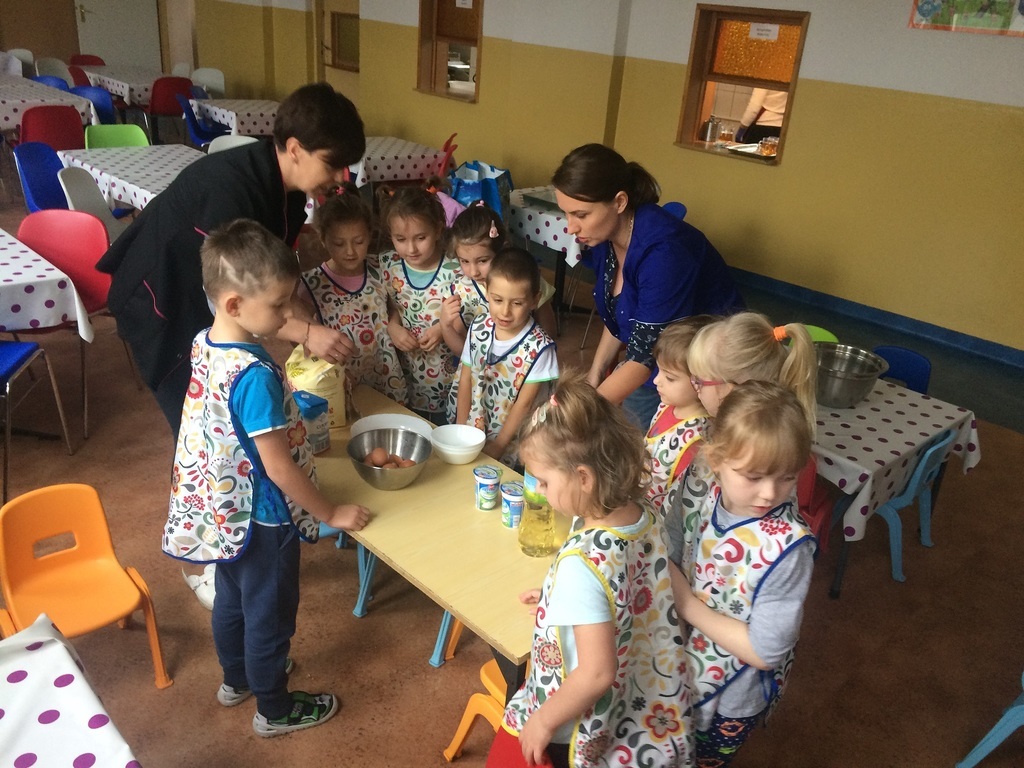 Ciekawostką i nowością w naszym przedszkolu są nowatorskie warsztaty kulinarne prowadzone w listopadzie przez mamusię Starszaka. Pani Ania zaproponowała cykl spotkań z przedszkolakami, których głównym zadaniem jest wspólne gotowanie. Jest to ogromna frajda ale również i zabawa. Dzieci w małej grupie, pod opieką mamy, pomocy nauczyciela i pracowników kuchni poznają tajniki przyrządzania pysznych potraw. Pierwszym wyzwaniem dla nich było pyszne ciasto jogurtowe, którego przepis widnieje na zdjęciu. Zapraszamy chętne mamusie do współpracy i wspólnej zabawy z nami...