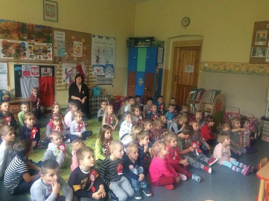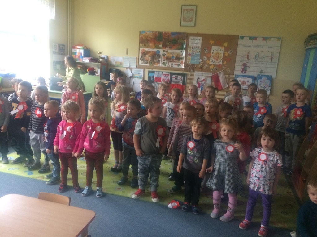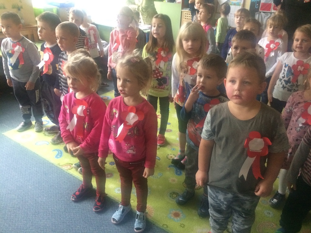 Uroczyste świętowanie 11 listopada, w naszej placówce odbyło się w poniedziałek. Przygotowania w przedszkolu trwały już od piątku. Dzieci w każdej grupie, samodzielnie wykonywały „kotylionki”. Grupa „Zerówka”, jako najstarsze przedszkolaki brała udział w akademii przygotowanej przez uczniów SP. Wszyscy razem jednak spotkaliśmy się u Średniaków, tam też zobaczyliśmy piękną prezentację multimedialną, na której przypomnieliśmy sobie nasze Symbole Narodowe oraz uroczyście odśpiewaliśmy Mazurka Dąbrowskiego.