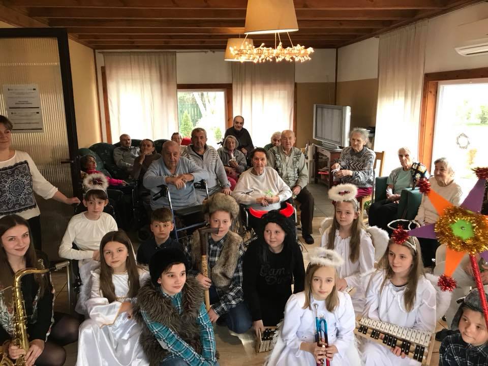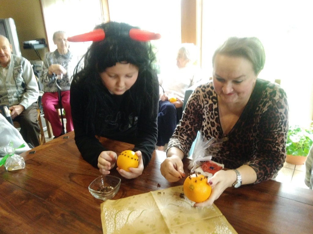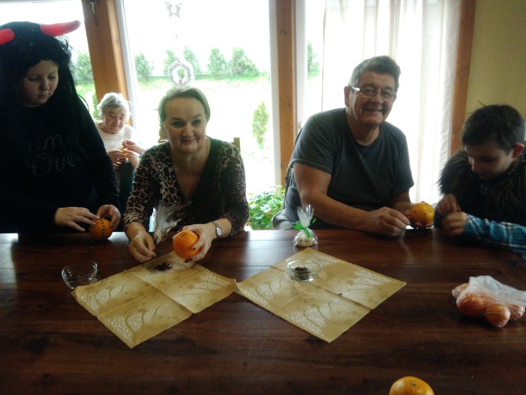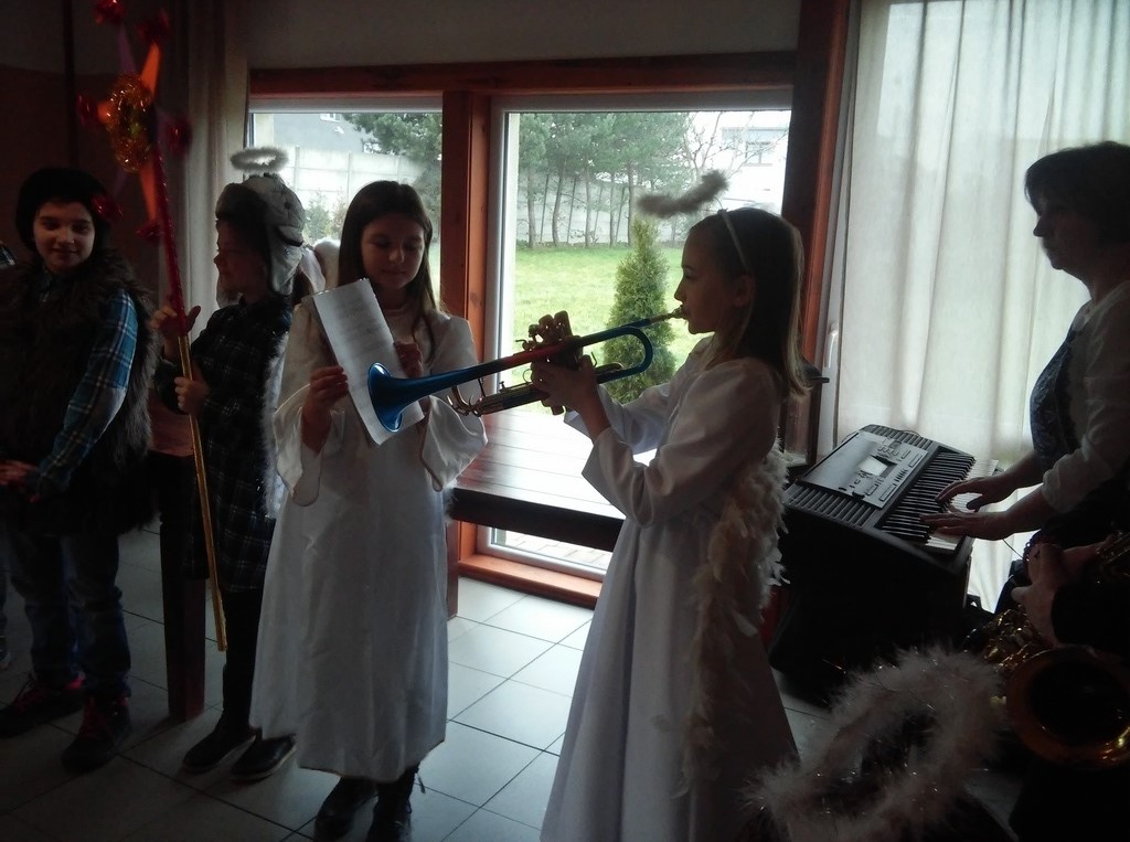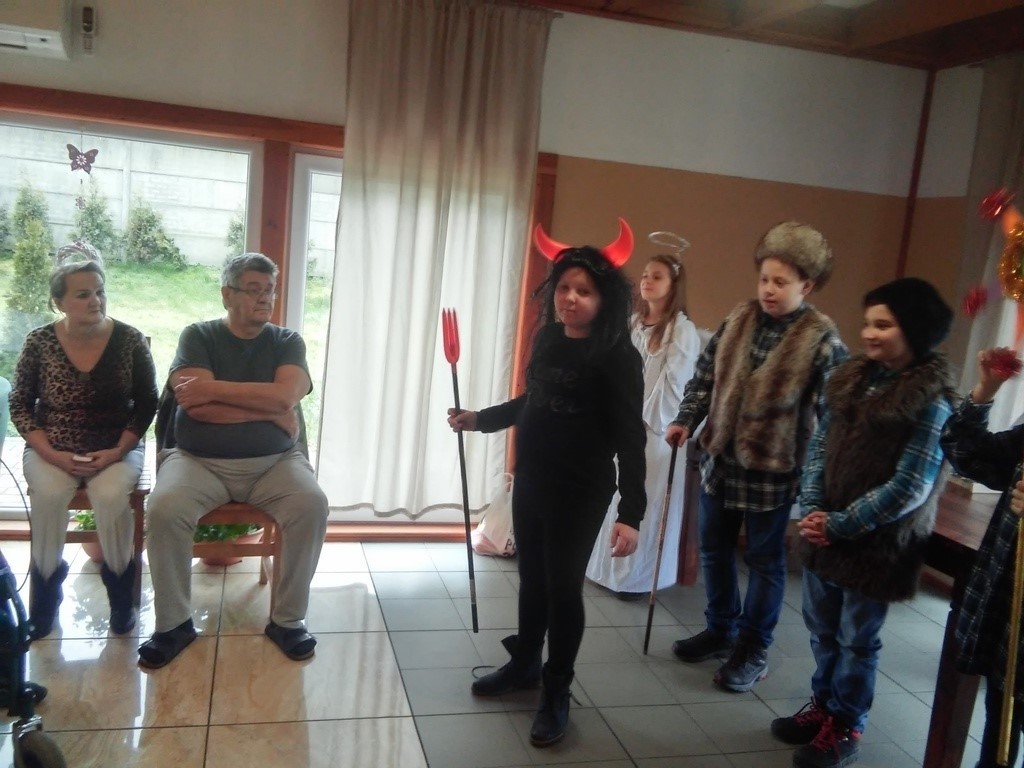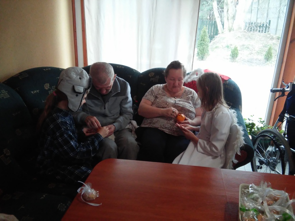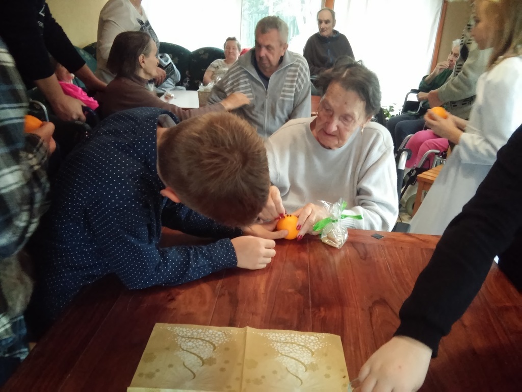 Z okazji Świąt Bożego Narodzenia 13 grudnia wolontariusze Szkolnego Klubu Wolontariatu działającego w naszej szkole, odwiedzili mieszkańców Rodzinnego Domu Opieki „Zielony Dworek” w Tąpkowicach. Uczniowie klasy V i uczennica z klasy VII - szkolni kolędnicy przedstawili tradycyjne bożonarodzeniowe scenki przeplatane kolędami z akompaniamentem instrumentów muzycznych. Mieszkańcy Domu Opieki chętnie włączyli się do wspólnego śpiewu, a na ich twarzach można było dostrzec wzruszenie. Po występie dzieci poczęstowały wszystkich przygotowanymi przez siebie świątecznymi ciasteczkami. Ważne i niezmiernie miłe dla wszystkich były chwile spędzone na indywidualnych rozmowach podczas dekorowania aromatycznych pomarańczy goździkami.