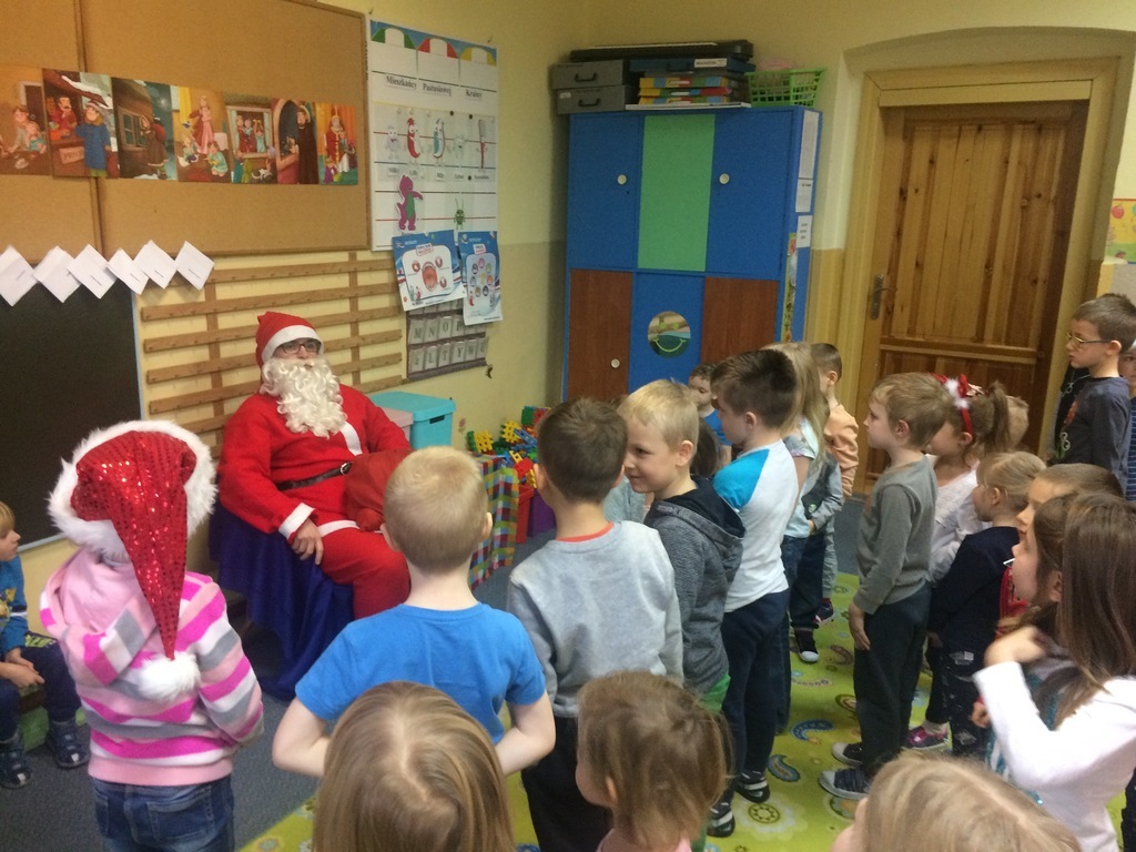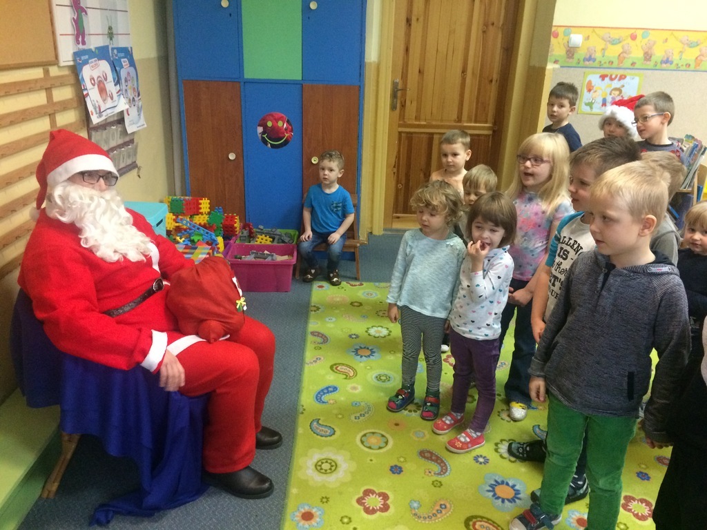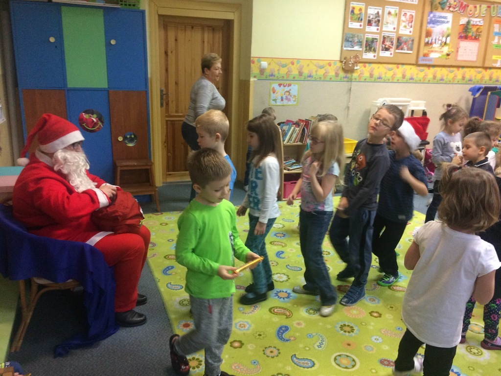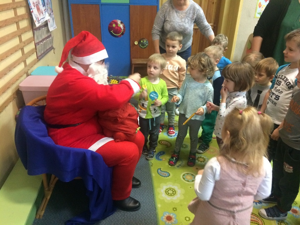 W tym roku dzieciaki były bardzo grzeczne, ponieważ Mikołaj spotkał się z nami aż dwa razy. 5 grudnia, zostaliśmy zaproszeni do Domu Kultury w Bobrownikach na przedstawienie pt. „Pingwiny z Zimowej Krainy”, a 6 grudnia odwiedził nas w przedszkolu. Cały czas grzecznie czekaliśmy na wyjątkowego gościa. Poznaliśmy jego prawdziwą historię, słuchając pięknego opowiadania, ćwiczyliśmy wspólną piosenkę dla Niego. Aż w końcu pojawił się w drzwiach i z radosnym uśmiechem powitał wszystkie dzieci. W nagrodę częstował słodkościami i obiecał, że w przyszłym roku znowu nas odwiedzi.