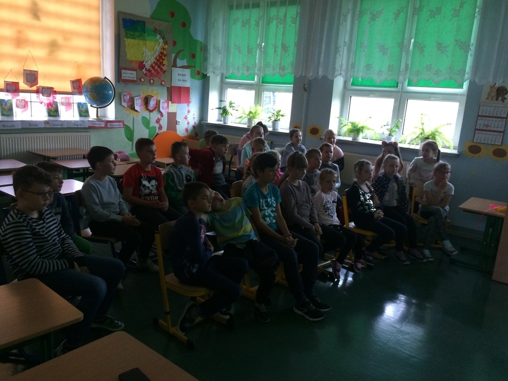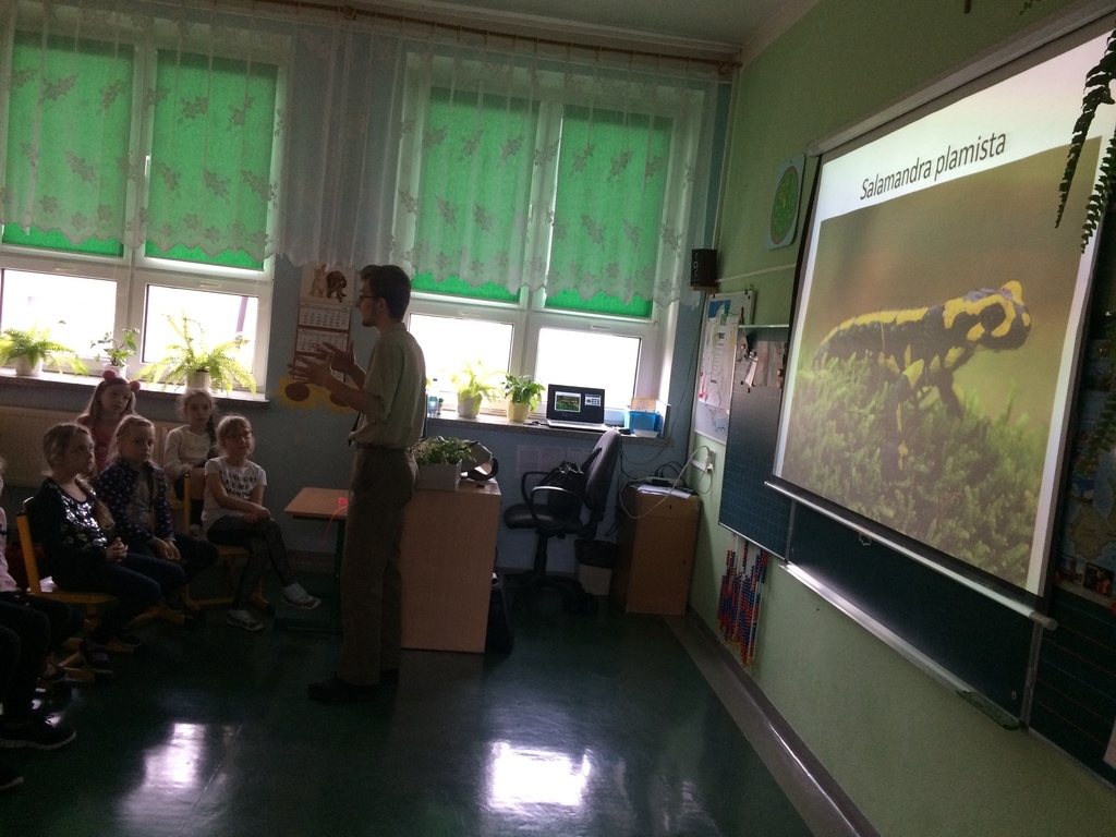 Leśnik pan Wiktor wyposażony w przyrodnicze okazy odwiedził uczniów w szkole. Uczniowie, choć bardzo zawiedzeni zmianą planów z radością powitali gościa. Leśnik opowiadał dzieciom o chronionych zwierzętach i roślinach. Swoją opowieść uzupełnił piękną prezentacja multimedialną i okazami przyrodniczymi. Gość zachęcał do częstego obcowania z przyrodą. Zwrócił także szczególną uwagę na bezpieczne korzystanie z uroków lasu.