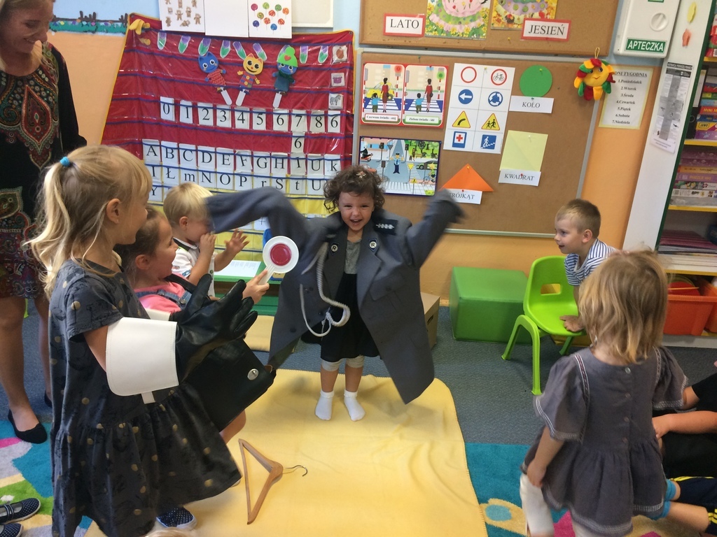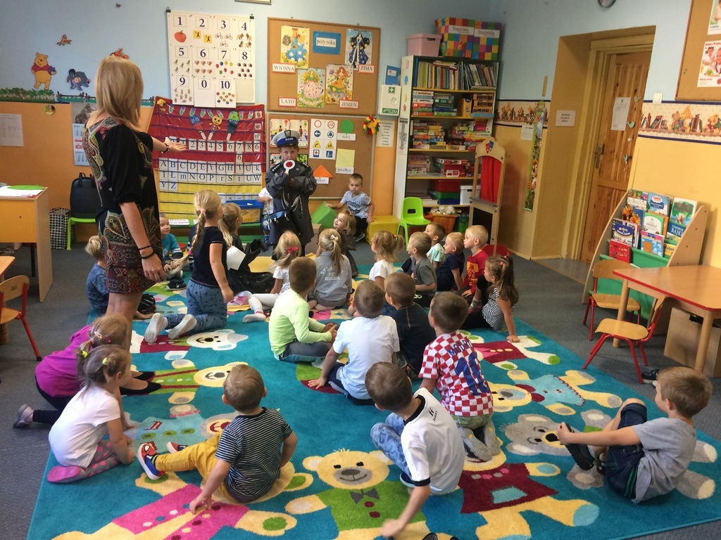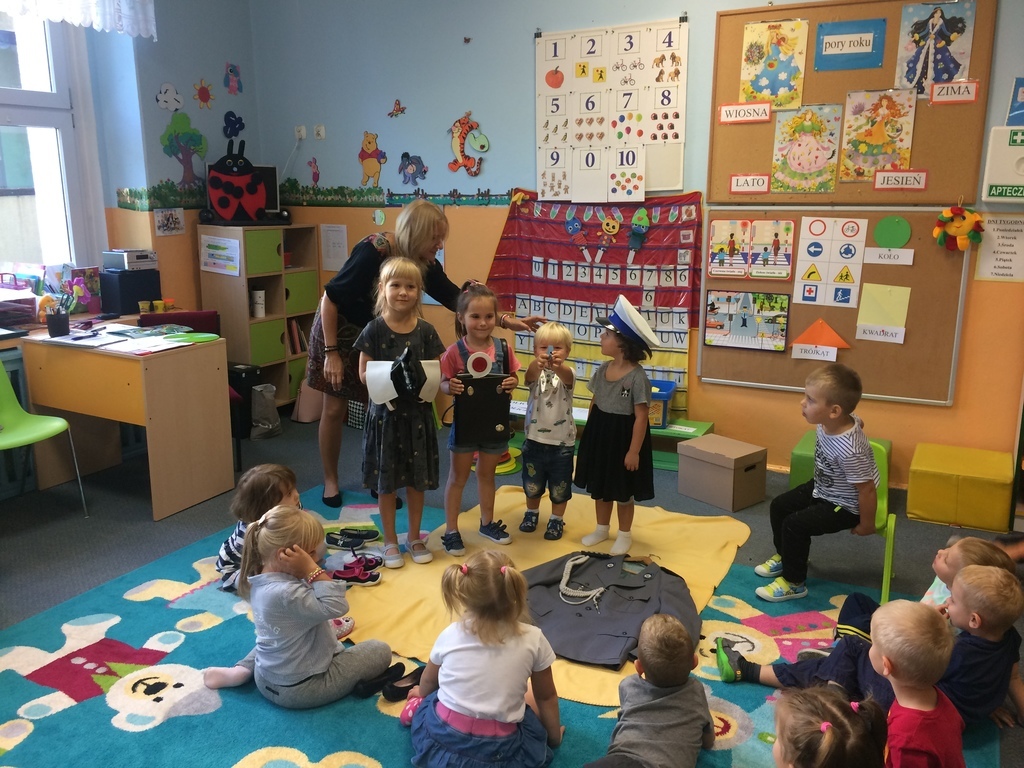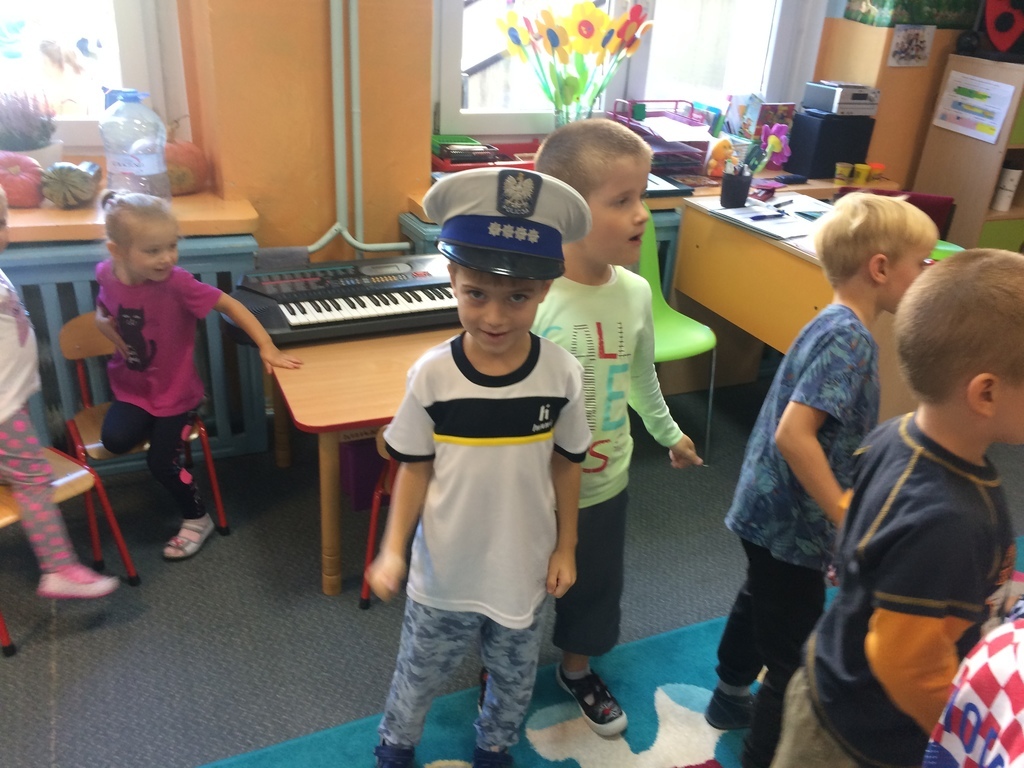 Bezpieczeństwo to najważniejsza sprawa – wszystkie przedszkolaki zaczęły poznawanie zawodów od zawodu policjanta. Na wspólnych warsztatach, miały możliwość dotknąć a nawet przymierzyć strój policjanta. Całe umundurowanie zostało nam udostępnione dzięki uprzejmości emerytowanego funkcjonariusza. W czasie spotkania zostały również utrwalone podstawowe zasady bezpiecznego poruszania się po drodze a także bezpiecznego podróżowania dzieci w samochodach. Kącik edukacyjny cieszył się dużym zainteresowaniem i rozwijał zainteresowania przedszkolaków.
