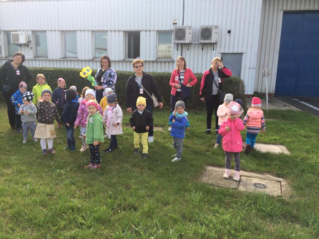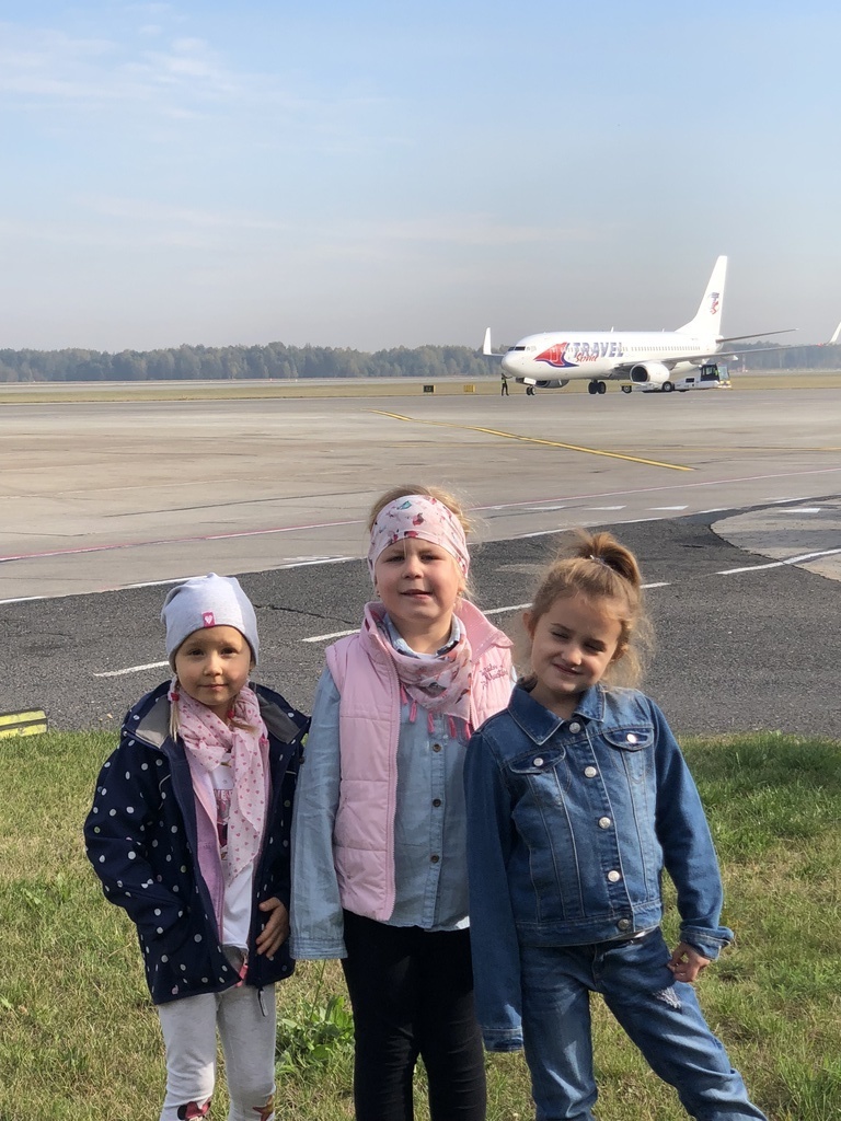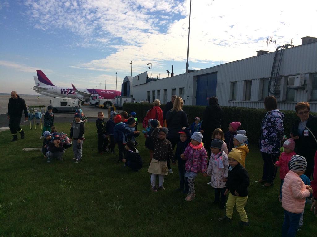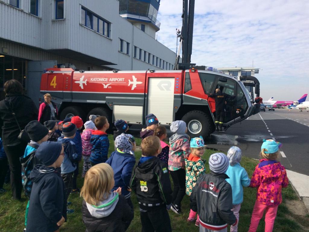 11 października w piękny słoneczny czwartek, po śniadaniu wszystkie dzieci z naszego przedszkola wyruszyły autokarem na wycieczkę do Międzynarodowego Portu Lotniczego w Pyrzowicach. Na dzień dobry musieliśmy przejść przez kontrolę Służb Ochrony Lotniska. Dzieci mogły zaobserwować pracę strażników oraz urządzeń wykorzystywanych do sprawdzania każdego przechodzącego na płytę lotniska. Następnie złożyliśmy wizytę strażakom Lotniskowej Służby Ratunkowo – Gaśniczej. Panowie pokazali nam wozy i sprzęty strażackie, zademonstrowali zjazd strażaków po rurze oraz pozwolili usiąść każdemu chętnemu przedszkolakowi za kierownicą wozu bojowego. Kolejną atrakcją był wyjazd wozu strażackiego z załogą i pokaz gaszenia wodą na płycie lotniska. Stojąc na trawniku przy płycie lotniska, dzieci miały również okazję obserwować lądujące i startujące samoloty pasażerskie. Pełni wrażeń opuściliśmy płytę lotniska i udaliśmy się na spotkanie z panem sokolnikiem, który na nas już czekał wraz z ptakami. Pan zapoznał nas z sokołem, który pracuje z nim na lotnisku i dba o bezpieczeństwo latających samolotów oraz zaprezentował sowę, która była dodatkową atrakcja – niespodzianką. Następnie całą grupą przeszliśmy na terminal lotniska, gdzie korzystając z windy dotarliśmy na taras widokowy. Znów mogliśmy podziwiać i oglądać startujące i lądujące samoloty. Wszystko było bardzo interesujące, wiele działo się na płycie lotniska, ale musieliśmy wracać do przedszkola, bo pora obiadowa już była blisko. W autokarze na dzieci czekała kolejna niespodzianka. Każdy uczestnik wycieczki otrzymał prezent z logo Airport – Katowice tzn. smycz i kłódkę z szyfrem do bagażu. Wszystkie przedszkolaki uśmiechem, kwiatami i dyplomami podziękowały pracownikom SOL, strażakom LSR – G oraz panu sokolnikowi za ciekawe spotkania i prezentacje. Szczególne podziękowania kierujemy do państwa Agnieszki i Sławomira Wacławczyk, którzy zaangażowali się w zorganizowanie wycieczki dla naszych milusińskich.
