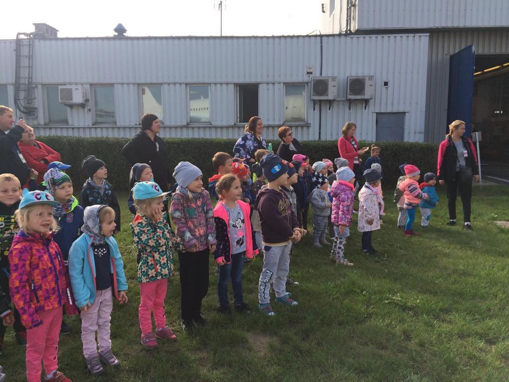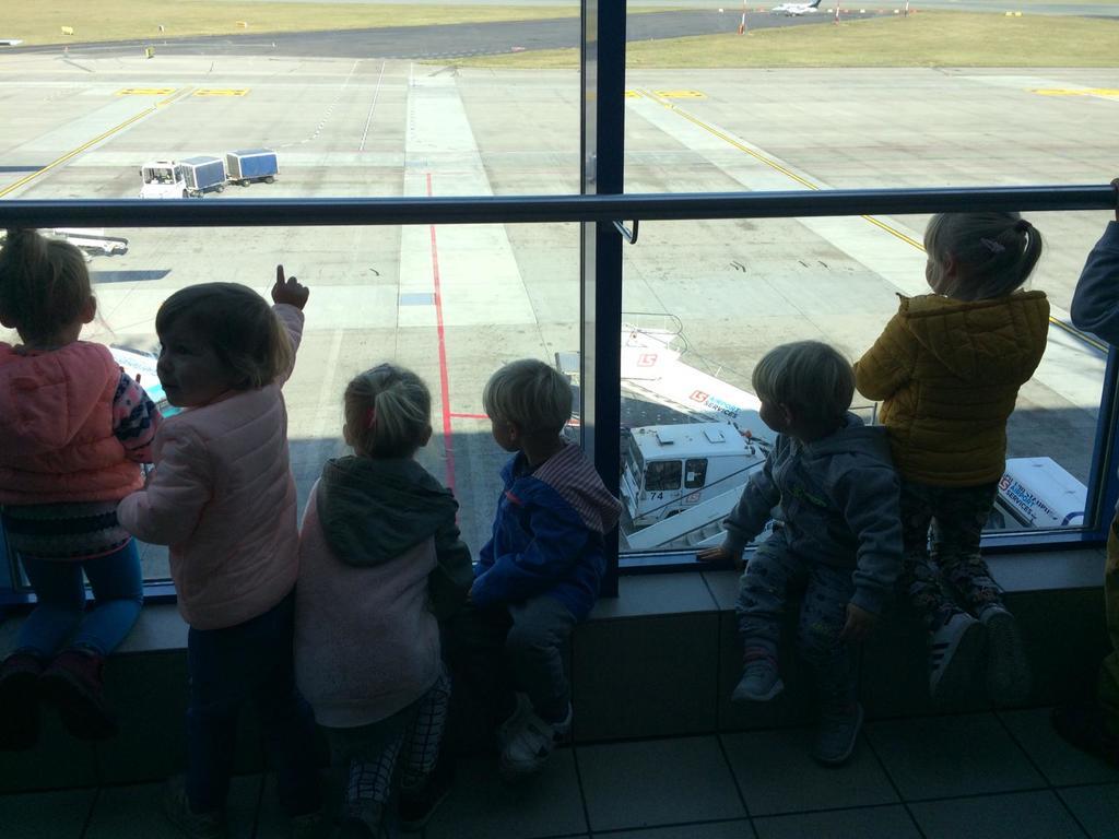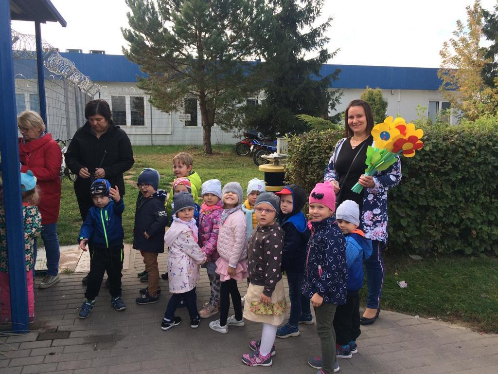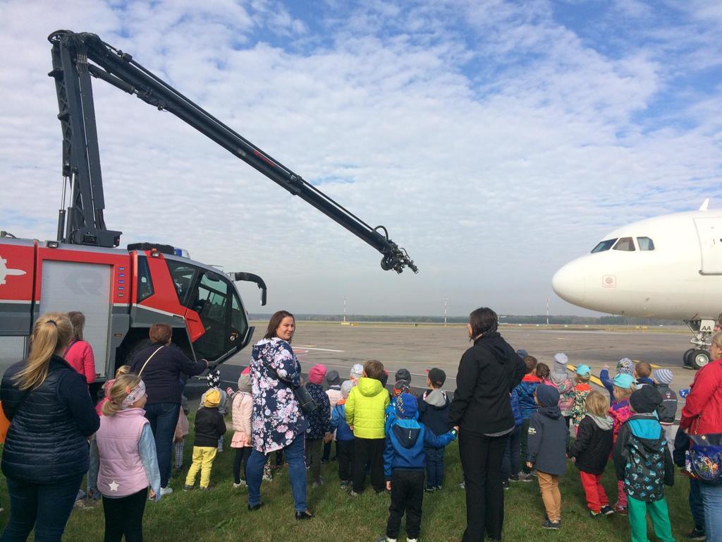 11 października w piękny słoneczny czwartek, po śniadaniu wszystkie dzieci z naszego przedszkola wyruszyły autokarem na wycieczkę do Międzynarodowego Portu Lotniczego w Pyrzowicach. Na dzień dobry musieliśmy przejść przez kontrolę Służb Ochrony Lotniska. Dzieci mogły zaobserwować pracę strażników oraz urządzeń wykorzystywanych do sprawdzania każdego przechodzącego na płytę lotniska. Następnie złożyliśmy wizytę strażakom Lotniskowej Służby Ratunkowo – Gaśniczej. Panowie pokazali nam wozy i sprzęty strażackie, zademonstrowali zjazd strażaków po rurze oraz pozwolili usiąść każdemu chętnemu przedszkolakowi za kierownicą wozu bojowego. Kolejną atrakcją był wyjazd wozu strażackiego z załogą i pokaz gaszenia wodą na płycie lotniska. Stojąc na trawniku przy płycie lotniska, dzieci miały również okazję obserwować lądujące i startujące samoloty pasażerskie. Pełni wrażeń opuściliśmy płytę lotniska i udaliśmy się na spotkanie z panem sokolnikiem, który na nas już czekał wraz z ptakami. Pan zapoznał nas z sokołem, który pracuje z nim na lotnisku i dba o bezpieczeństwo latających samolotów oraz zaprezentował sowę, która była dodatkową atrakcja – niespodzianką. Następnie całą grupą przeszliśmy na terminal lotniska, gdzie korzystając z windy dotarliśmy na taras widokowy. Znów mogliśmy podziwiać i oglądać startujące i lądujące samoloty. Wszystko było bardzo interesujące, wiele działo się na płycie lotniska, ale musieliśmy wracać do przedszkola, bo pora obiadowa już była blisko. W autokarze na dzieci czekała kolejna niespodzianka. Każdy uczestnik wycieczki otrzymał prezent z logo Airport – Katowice tzn. smycz i kłódkę z szyfrem do bagażu. Wszystkie przedszkolaki uśmiechem, kwiatami i dyplomami podziękowały pracownikom SOL, strażakom LSR – G oraz panu sokolnikowi za ciekawe spotkania i prezentacje. Szczególne podziękowania kierujemy do państwa Agnieszki i Sławomira Wacławczyk, którzy zaangażowali się w zorganizowanie wycieczki dla naszych milusińskich.