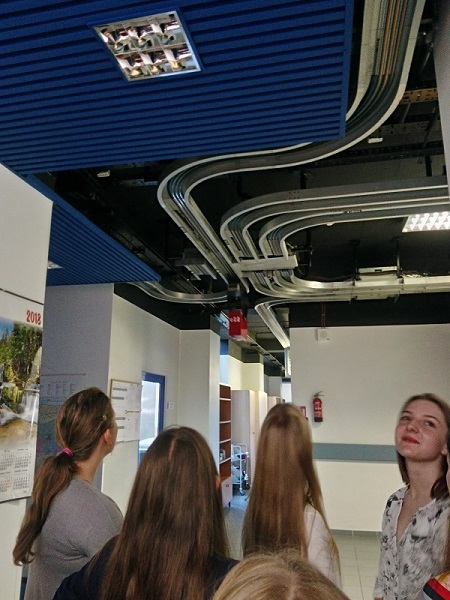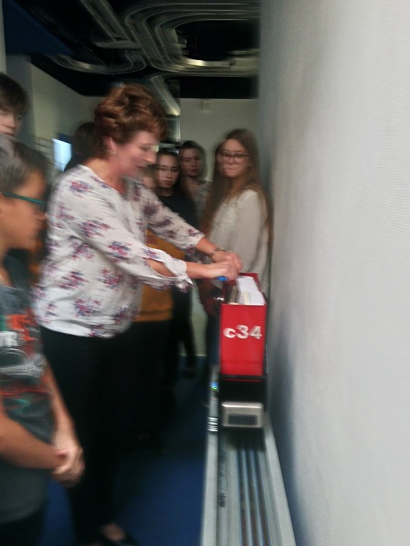 Wielkie wrażenie na uczniach zrobił pokaz dostarczania książek z magazynu do czytelni lub wypożyczalni za pomocą małych wózeczków, sterowanych elektronicznie.