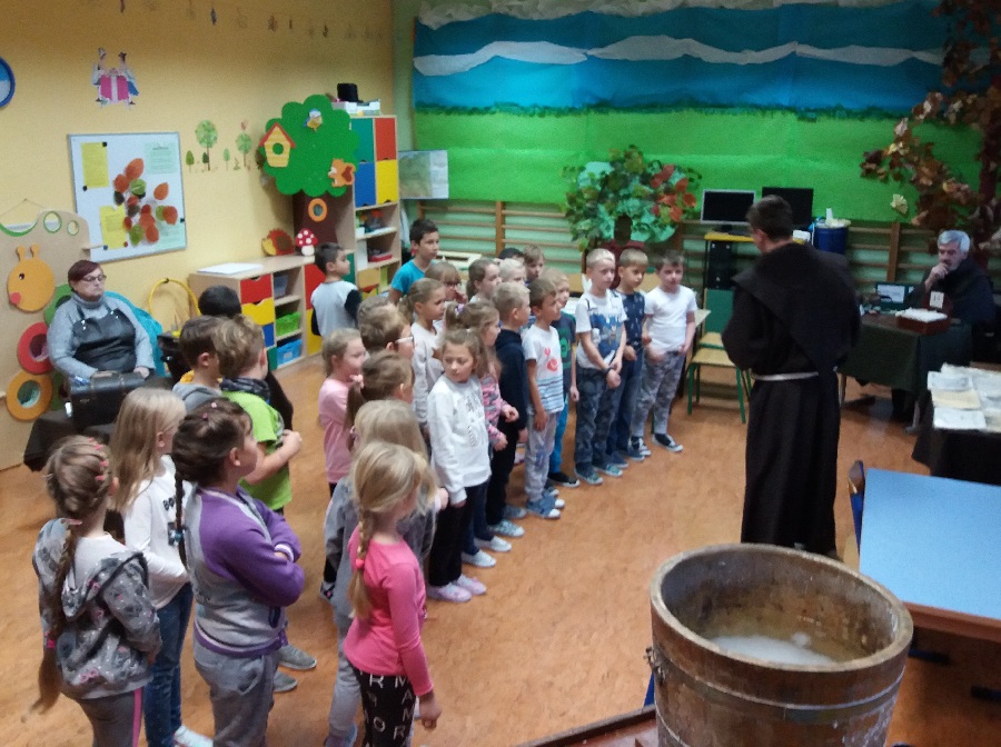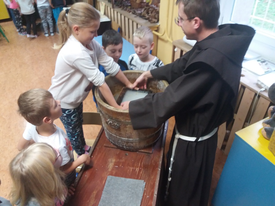 Aby obrazowo ukazać czasy – erą Gutenberga zwane – osoby prowadzące zajęcia wystąpiły w dawnych strojach rzemieślniczych: drukarz oraz zecer.