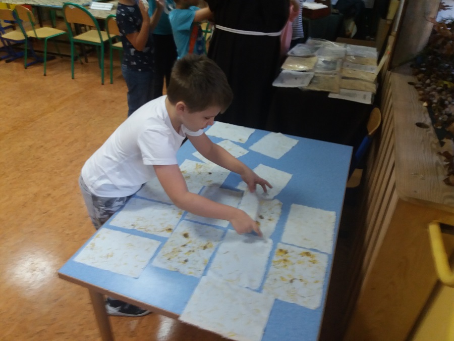 - czerpanie papieru wraz z zatopionymi płatkami kwiatów w masie papierniczej