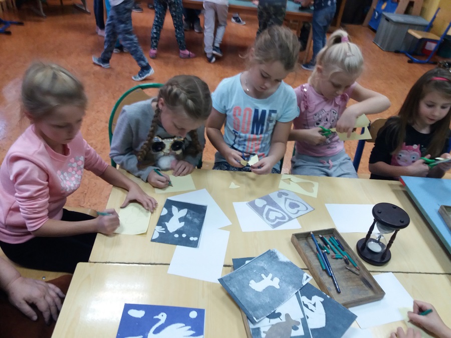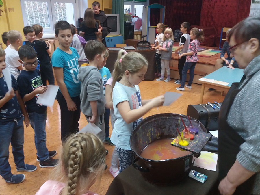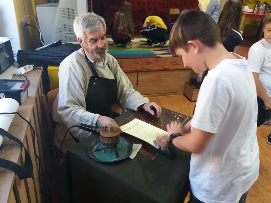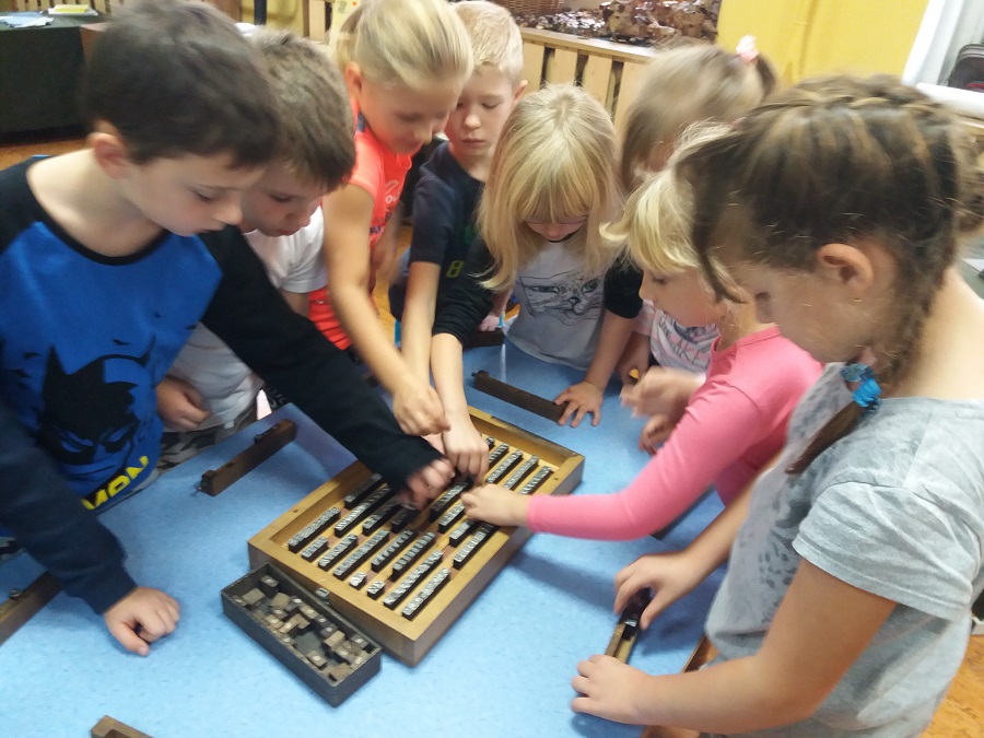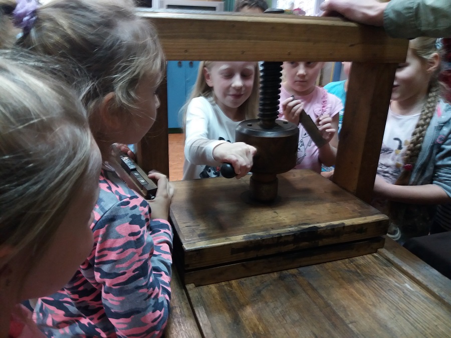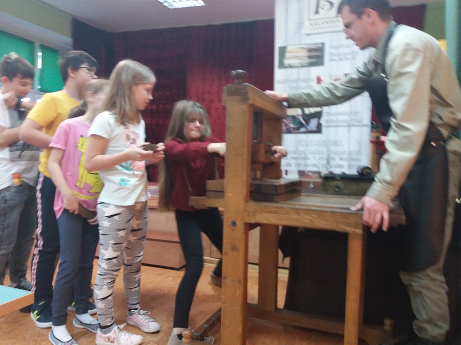 Każdy uczeń na dużej prasie drukarskiej – wzorowanej na prasie Gutenberga, po wcześniejszym samodzielnym przygotowaniu składu czcionek, wydrukował stylowy certyfikat młodego czeladnika.