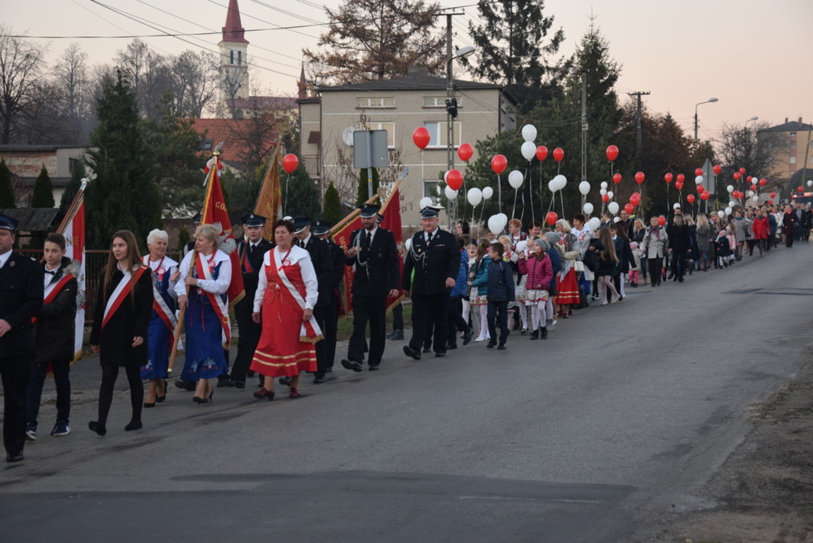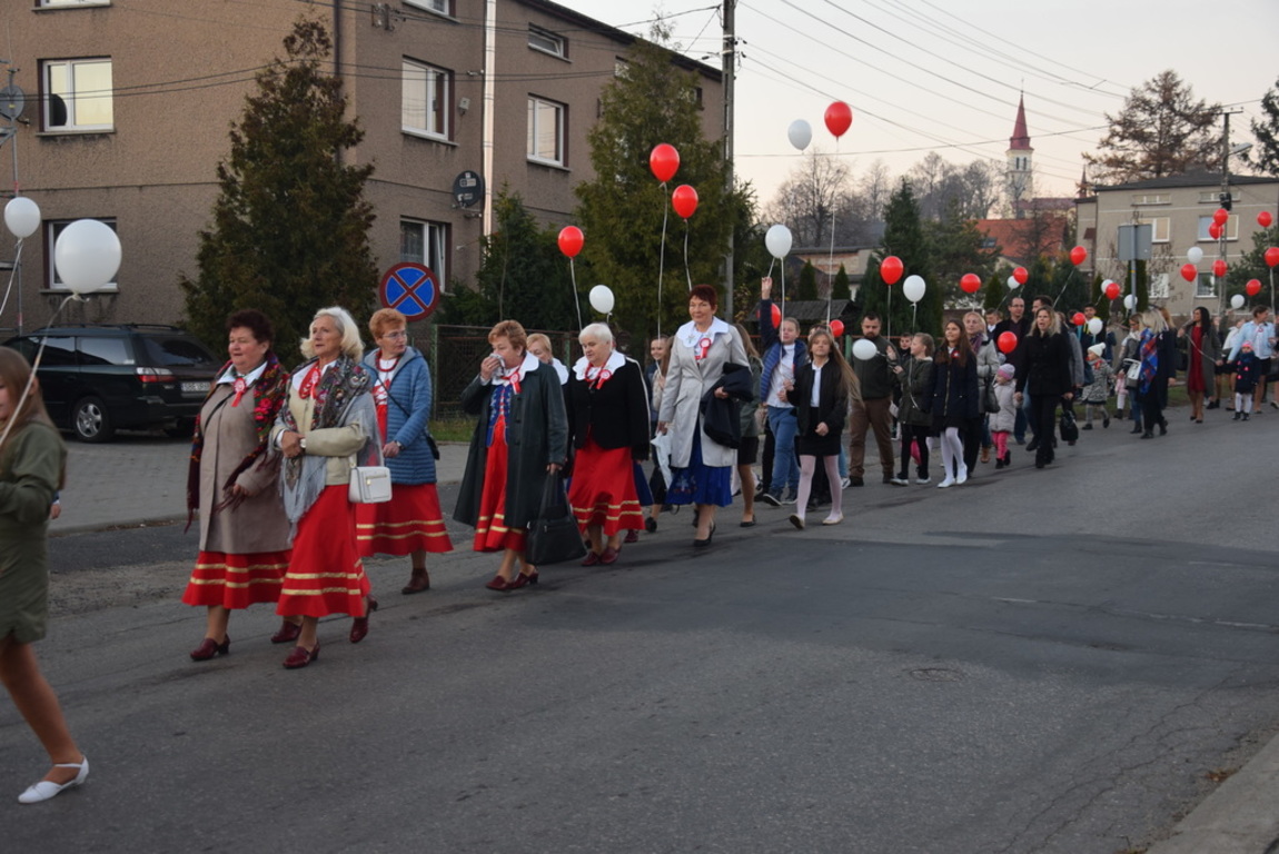 Kulminacyjnym punktem jubileuszowych obchodów był biało – czerwony pochód, który przeszedł ulicami Sączowa na trasie od Kościoła do Domu Kultury w Sączowie. Wzięli w nim udział wszyscy uczestnicy uroczystości. Elementem dekoracyjnym pochodu były baloniki napełnione helem w barwach narodowych. Ten element dekoracyjny przygotowali druhowie strażacy z OSP w Sączowie.