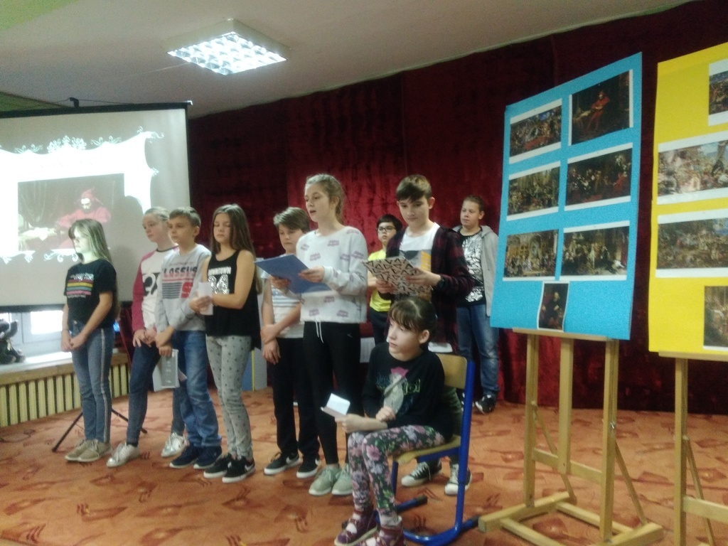 14 listopada klasa VI zaprosiła koleżanki i kolegów na prezentację sylwetki kolejnego ze słynnych Polaków - Jana Matejki. Uczniowie przedstawili ciekawy zyciorys malarza, a takze zaprezentowali najbardziej znane obrazy mistrza. Słowom towarzyszyły ilustracje dzieł takich jak: Stańczyk, Hołd Pruski, Kazanie Skargi, Zawieszenie Dzwonu Zygmunta, Kochanowski nad zwłokami Urszulki.