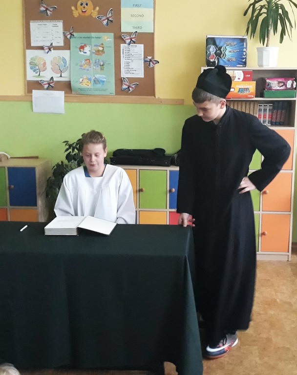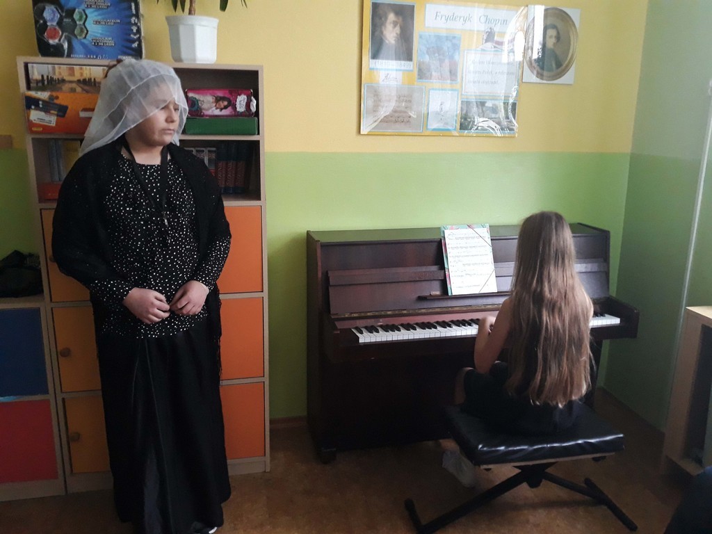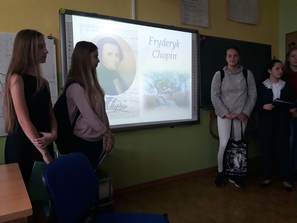 Klasa VII przygotowała ciekawą podróż do miejsc związanych z życiem Fryderyka i przedstawiła wiele epizodów z życia kompozytora. Z podziwem i uwagą publiczność wsłuchiwała się w dźwięki mazurków, polonezów, etiud, nokturnów i preludiów, które skomponował Chopin. W wykonaniu Natalii Łukasik i Julii Kocot usłyszeliśmy nokturn i preludium op.28 nr4. Prezentacji twórczości wielkiego kompozytora towarzyszyła poezja.