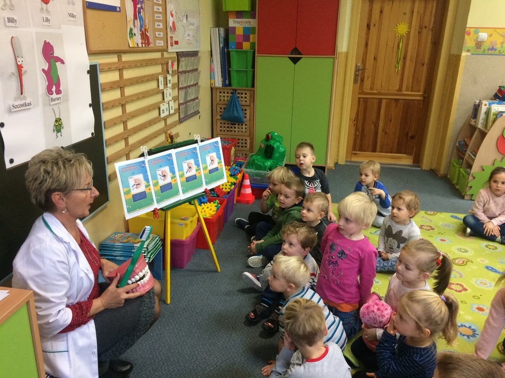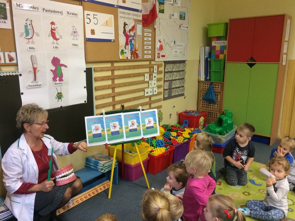 Kolejny już rok nasze przedszkolaki biorą udział w Ogólnopolskim Programie Edukacji Zdrowotnej dla przedszkolaków – Akademia Aquafresh. To już VIII edycja programu w czasie której dzieci poznają przygody „Pastusiowej Krainy”. Głównym celem programu jest wykształcenie w dzieciach nawyku codziennego dbania o higienę jamy ustnej. Na drugie spotkanie zaprosiliśmy Panią higienistkę, która zawsze chętnie nas odwiedza. Pani Stasia przypomniała wszystkim zasady prawidłowego szczotkowania ząbków i wspólne z nami oglądała film edukacyjny „Co powinniśmy wiedzieć o szczoteczce do zębów”.