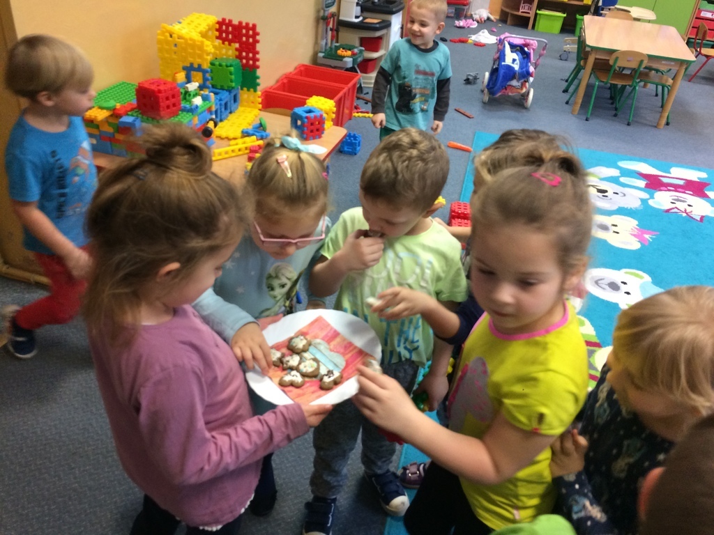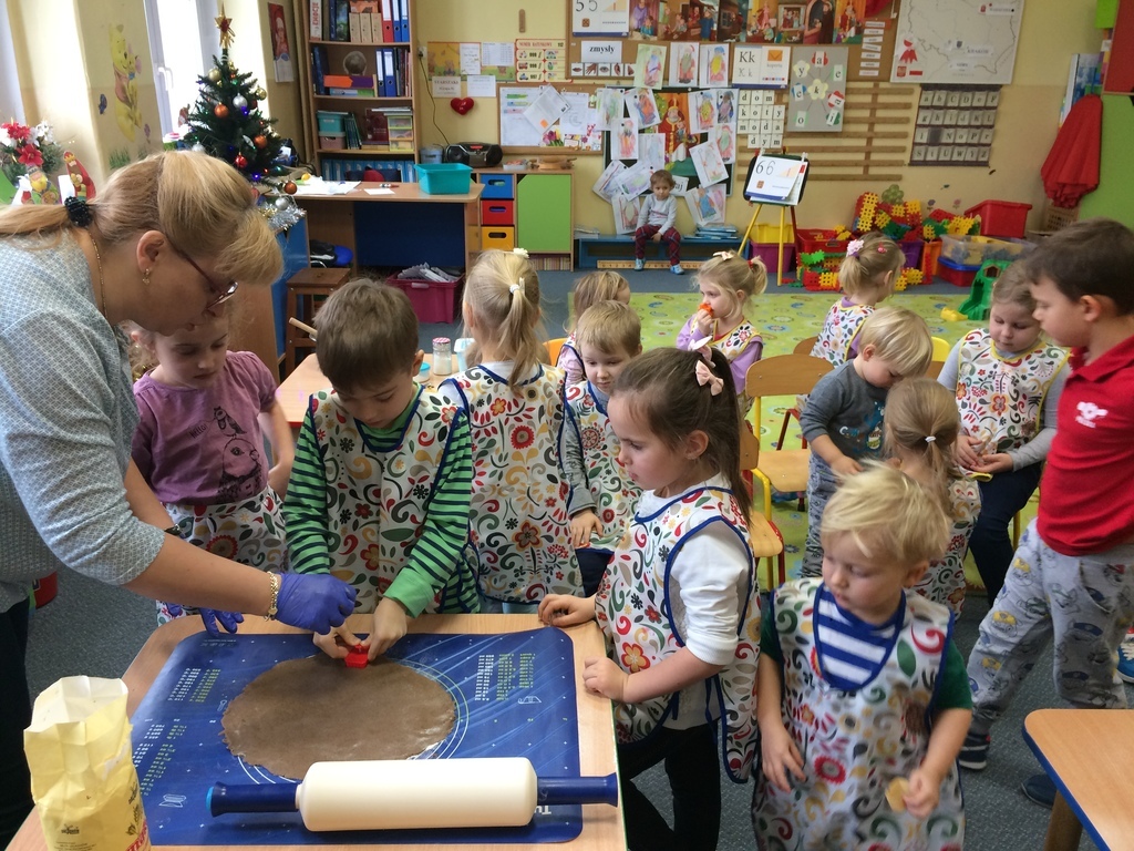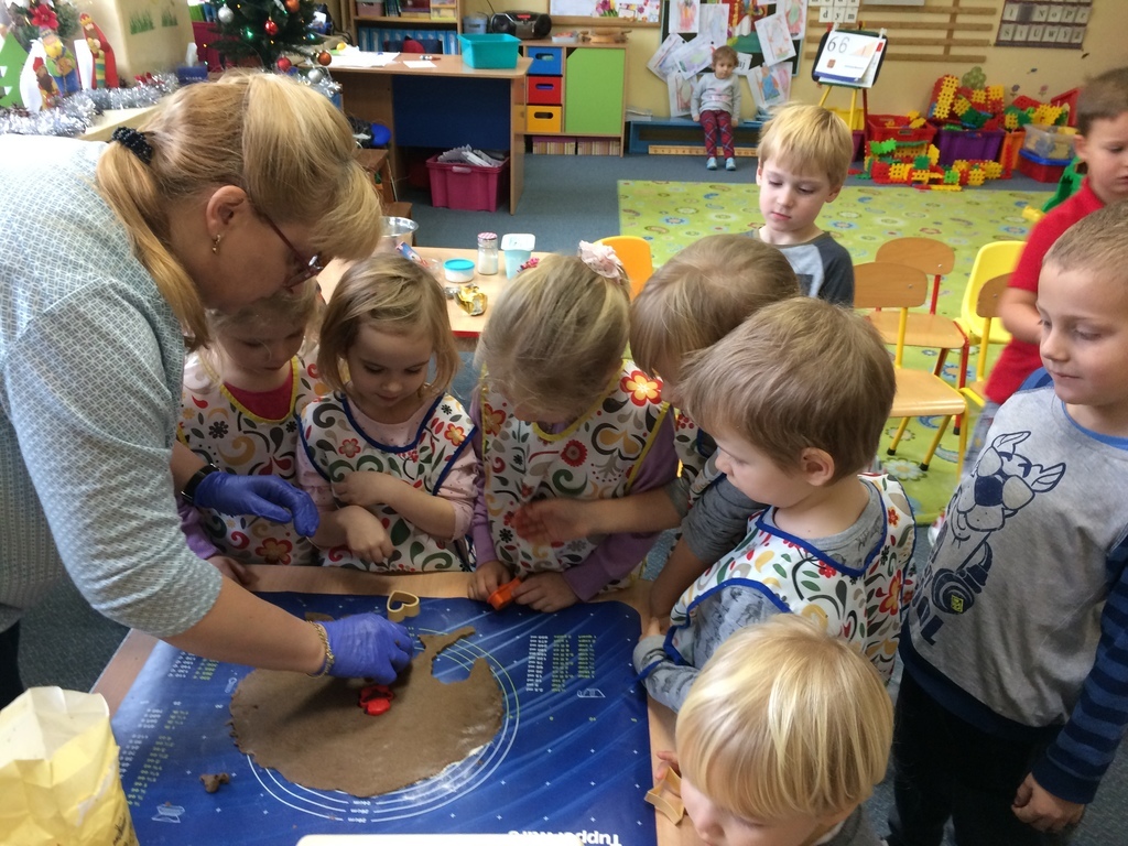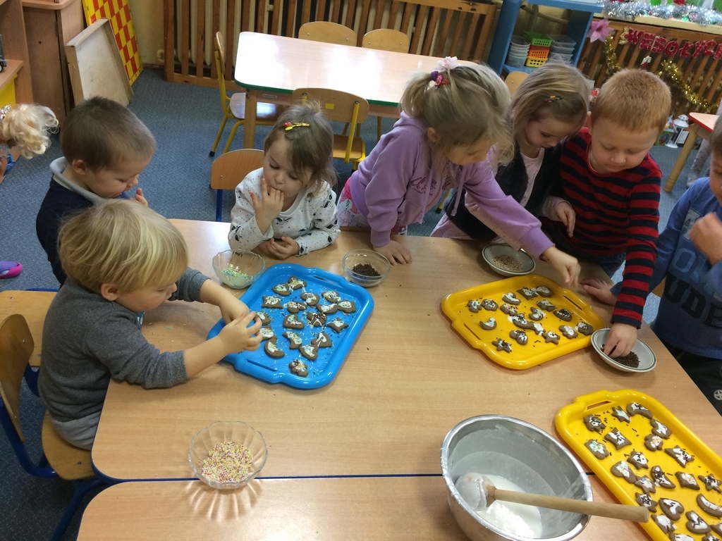 w przedszkolu pachnie świętami. Przedszkolaki zorganizowały słodką świąteczną cukiernię. Dzieci samodzielnie zagniatały ciasto, wykrawały kształty pierników, a największą radością było zdobienie słodkim lukrem i kolorowymi posypkami. W tym roku spotkaliśmy się rodzinnie. Przy muzyce pięknych kolęd Maluchy i Starszaki wspólnie cieszyli się spędzaniem czasu. Pierniczki wyszły pyszne i pachnące, wszyscy w przedszkolu częstowali się naszymi wypiekami. Dziękujemy Pani Dyrektor, która zorganizowała dla nas ciasto na pierniki. Życzymy wszystkim, aby czas świąteczny spędzony był w ciepłej rodzinnej atmosferze.