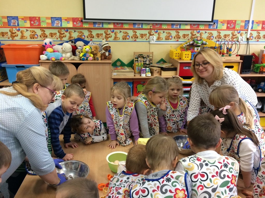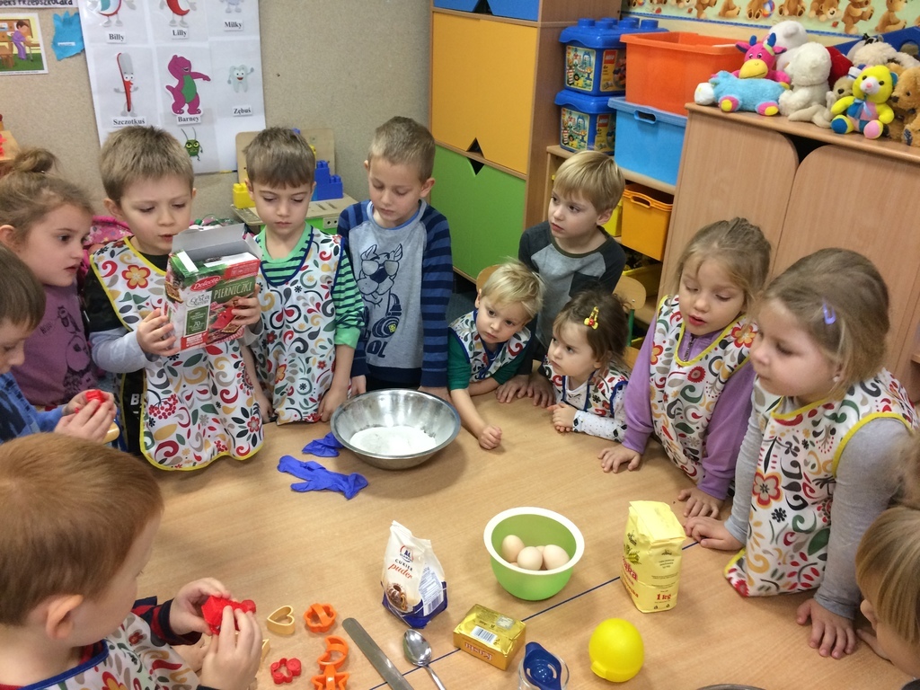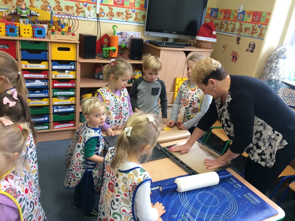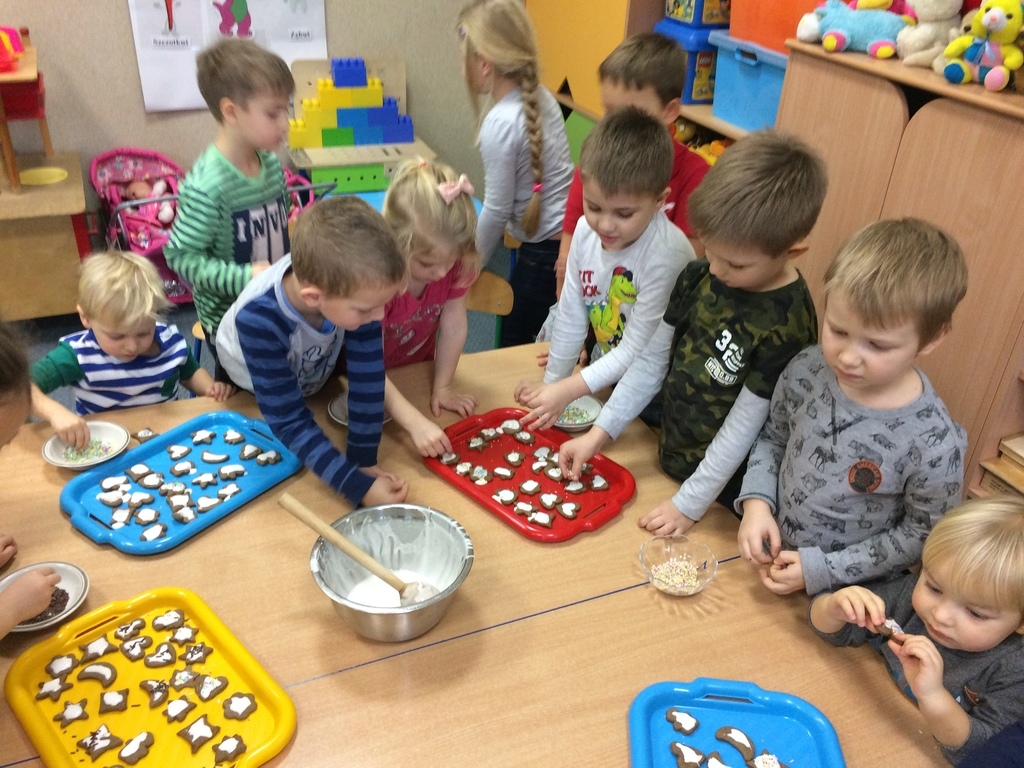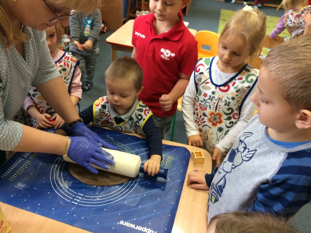 w przedszkolu pachnie świętami. Przedszkolaki zorganizowały słodką świąteczną cukiernię. Dzieci samodzielnie zagniatały ciasto, wykrawały kształty pierników, a największą radością było zdobienie słodkim lukrem i kolorowymi posypkami. W tym roku spotkaliśmy się rodzinnie. Przy muzyce pięknych kolęd Maluchy i Starszaki wspólnie cieszyli się spędzaniem czasu. Pierniczki wyszły pyszne i pachnące, wszyscy w przedszkolu częstowali się naszymi wypiekami. Dziękujemy Pani Dyrektor, która zorganizowała dla nas ciasto na pierniki. Życzymy wszystkim, aby czas świąteczny spędzony był w ciepłej rodzinnej atmosferze.