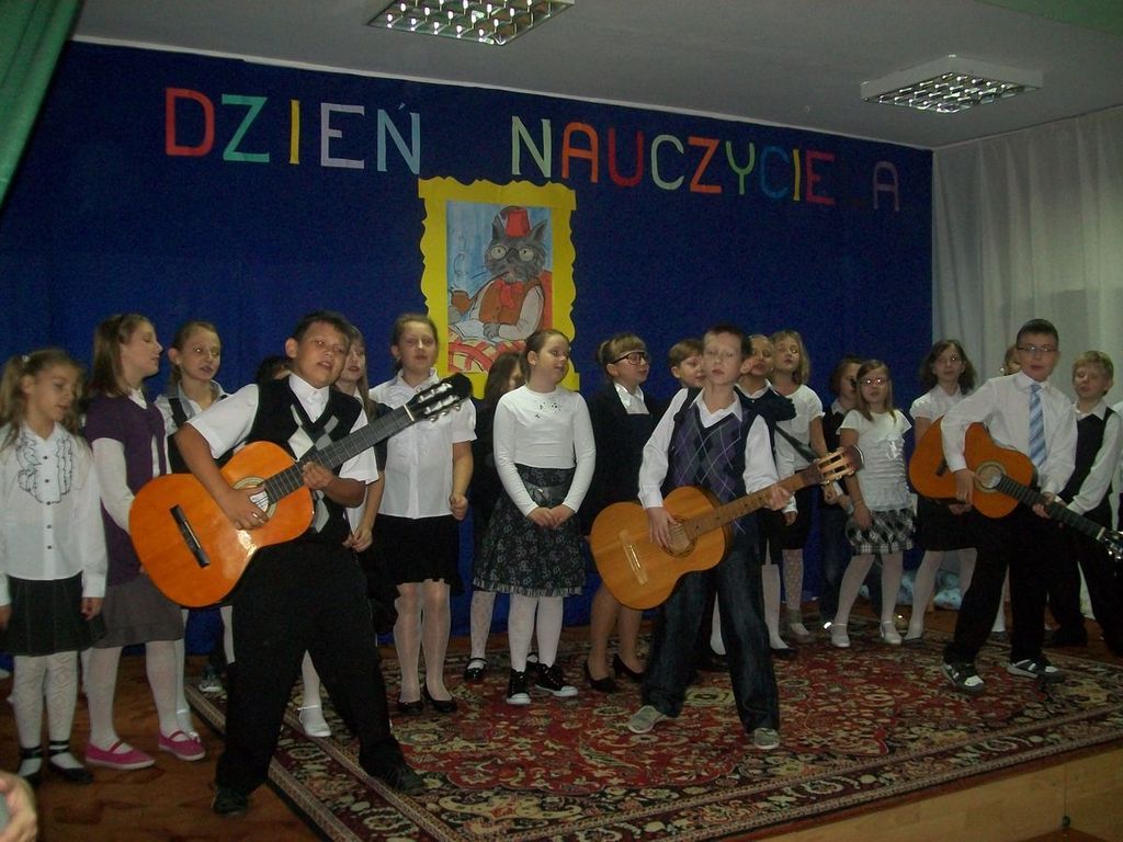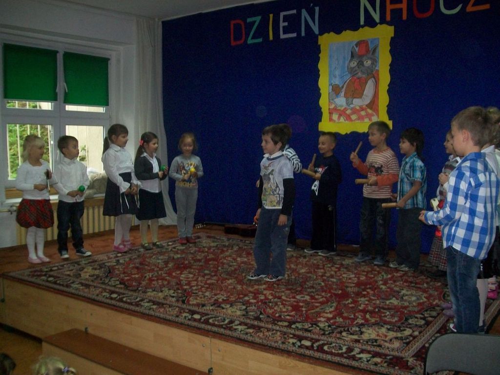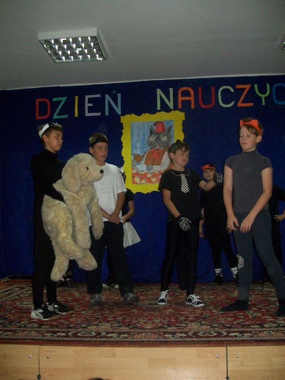 W akademii brały udział przedszkolaki, uczniowie klas III i V oraz nasza Pani Dyrektor. Maluchy grały na różnych instrumentach, klasa III podziękowała nauczycielom i wszystkim pracownikom naszej szkoły wierszami i piosenką za codzienną pracę i trud. Klasa V przygotowała zabawne przedstawienie pod tytułem „Szkolne Przygody Pimpusia Sadełko”. W tym przedstawieniu , którego akcja odbyła się w kociej szkole, zaprezentowała swoje umiejętności aktorskie także Pani Dyrektor. Mogliśmy zobaczyć perypetie leniwego kota – Pimpusia, na stancji u pani Matusowej. Wszystkich bardzo rozbawił utwór Marii Konopnickiej wystawiony na szkolnej scenie. Na szczególne oklaski zasłużył odtwórca tytułowej roli - Mateusz Mazan.