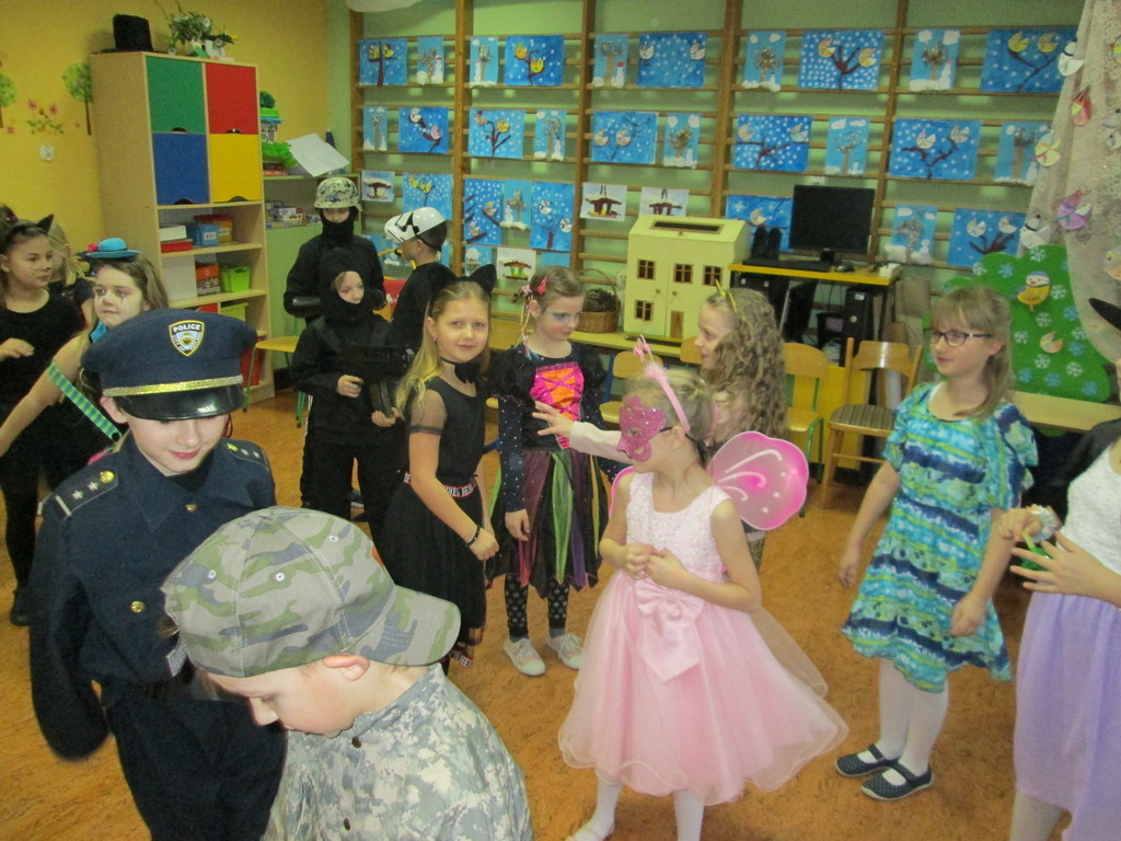 W ostatnim dniu przed feriami, w piątek 8 lutego uczniowie klasy I i II spotkali się na wesołej zabawie. W szkolnej świetlicy, która zamieniła się w zaczarowaną krainę pojawiły się postacie z bajek i legend. Przy dźwiękach skocznej muzyki wszyscy wesoło pląsali, tuptali i podrygiwali. Każdy robił to co potrafił, to, na co miał ochotę i co mu w duszy grało.