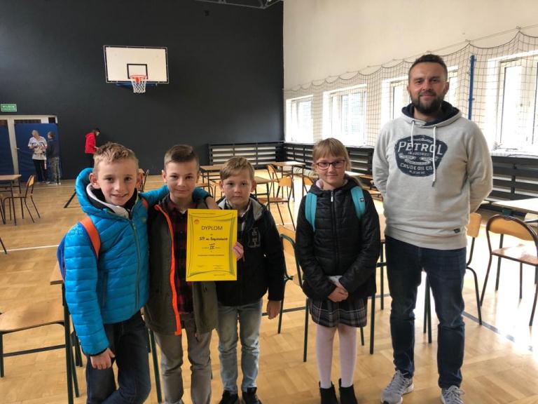 W poniedziałek 7 października drużyna w składzie: Marta Cabaj i Paweł Kuwak (kl. III) oraz Szymon Balcerzak i Konrad Grabski (kl. V) pojechała do Rogoźnika na Gminny Turniej Szachowy, gdzie na wysokim poziomie rozegrali wszystkie partie szachowe. Wyniki zmagań na szachownicy były bardzo dobre - zdobyli I miejsce, a tym samym awans do turnieju powiatowego. We wtorek ta sama drużyna wyruszyła do Wojkowic Kościelnych, gdzie rywalizowali z najlepszymi zawodnikami z powiatu będzińskiego (SP nr 2 Czeladź, ZSP Wojkowice Kościelne, SP nr 8 Będzin i SP nr 4 Będzin). Nasi uczniowie bardzo dzielnie zmagali się w rozgrywkach, każda runda była owocna w punkty dla naszej drużyny i do ostatniej rundy walczyli o awans do turnieju rejonowego. W efekcie zajęliśmy IV miejsce, a przy tym bardzo wiele pochwał od sędziego p. Bartka Bratka, a także trenerów innych szkół. Nasza reprezentacja składała się z najmłodszych uczniów oraz w naszej drużynie jako jedynej, nie było zawodników klubowych. Gratulujemy naszym graczom szachowym i życzymy im dalszych sukcesów, w tej jakże trudnej dyscyplinie sportu.