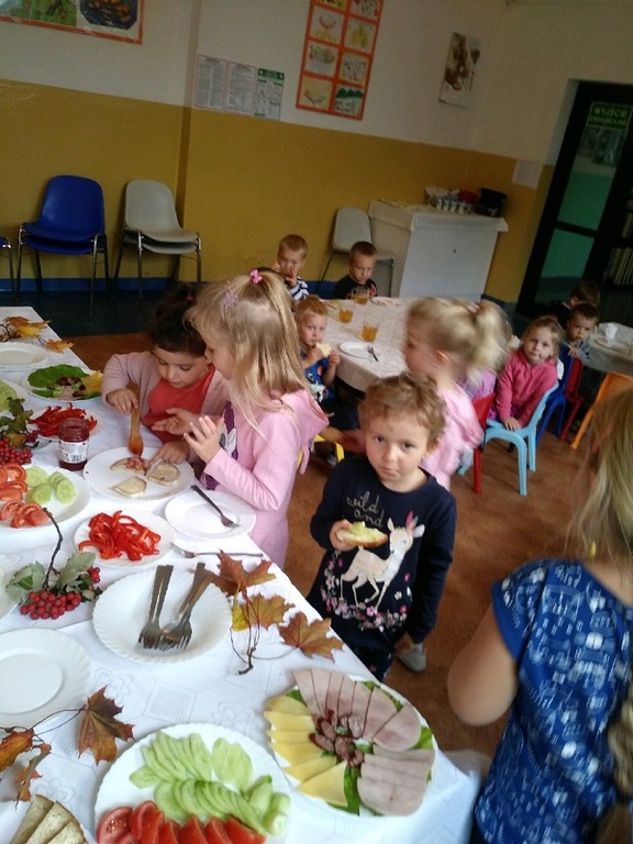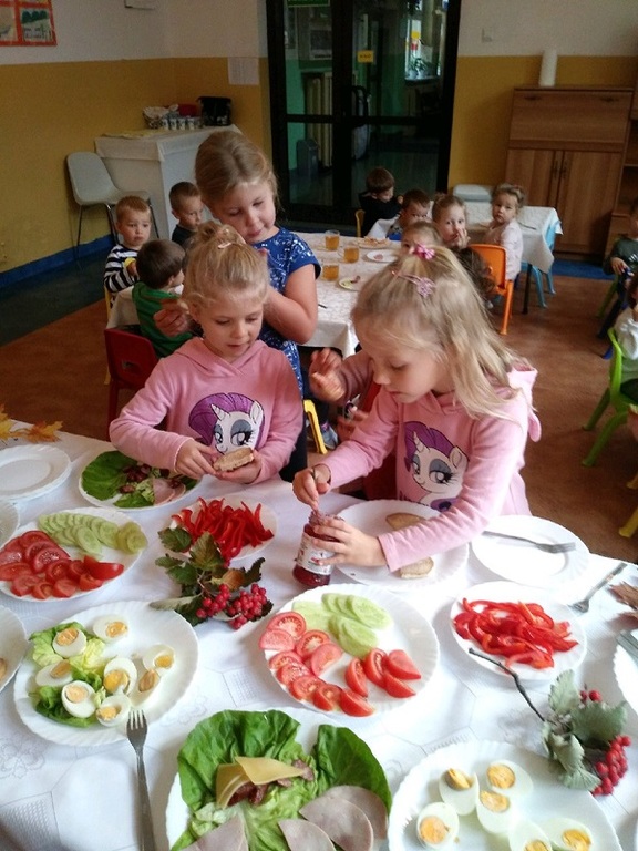 W naszym przedszkolu cyklicznie odbywają się śniadania w formie „szwedzkiego stołu”. Przedszkolaki samodzielnie wykonują kanapki podczas śniadania. Mają do wyboru: zdrowe i smaczne produkty. Dzieci same decydują o tym, co znajdzie się na ich kanapkach. Śniadania sporządzone według własnego pomysłu bardzo smakują przedszkolakom.