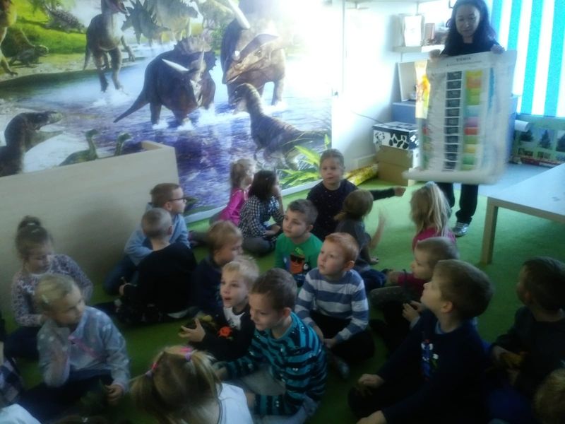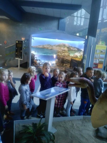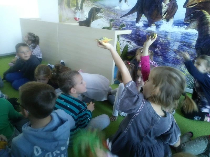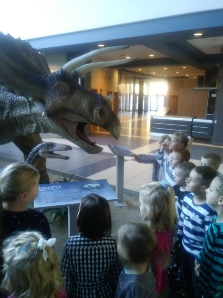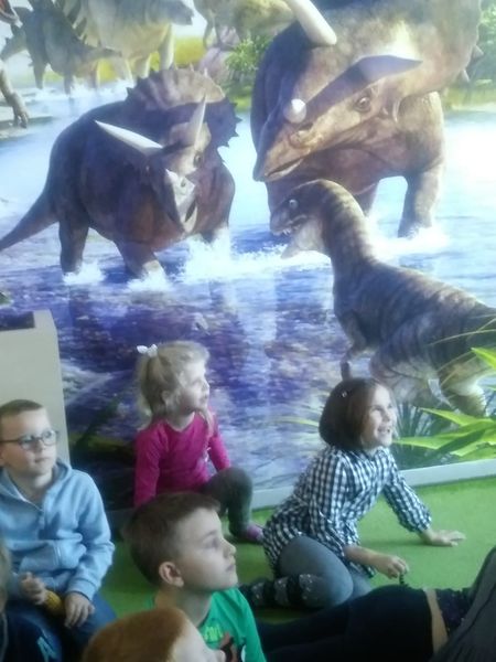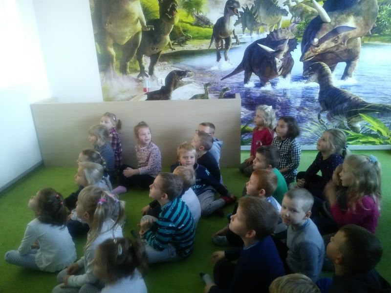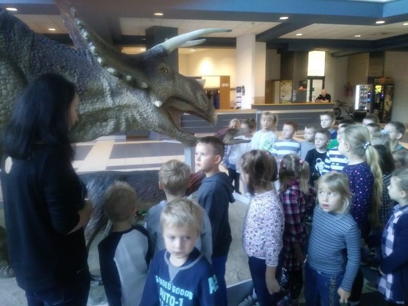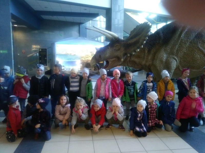 18 października odbyła się pierwsza wycieczka edukacyjna z cyklu lekcji muzealnych na Wydziale Nauk o Ziemi w Sosnowcu. Na wycieczkę wyjechały najstarsze przedszkolaki w integracji z pierwszoklasistami. Dzieci wzięły udział w wykładzie oraz zajęciach warsztatowych pod tytułem „W świecie dinozaurów”. Zajęcia rozpoczęły się przy modelu Tyranozaura, Cylofyza i Triceratopsa. Dzieci poznały różnorodność i charakterystyczne cechy poszczególnych gatunków zwierząt. Oglądały kości dinozaurów oraz miały możliwość zabawy tematycznej w grupach figurami zwierząt. Zajęcia miały na celu rozbudzanie zainteresowań dzieci i wzbogacenie ich wiadomości z zakresu prehistorii. Przedszkolaki mogły pochwalić się zdobytą wiedzą w teście „Na szóstkę”, odpowiedziały poprawnie na wszystkie pytania i otrzymały w nagrodę pamiątkowe breloczki z dinozaurami.