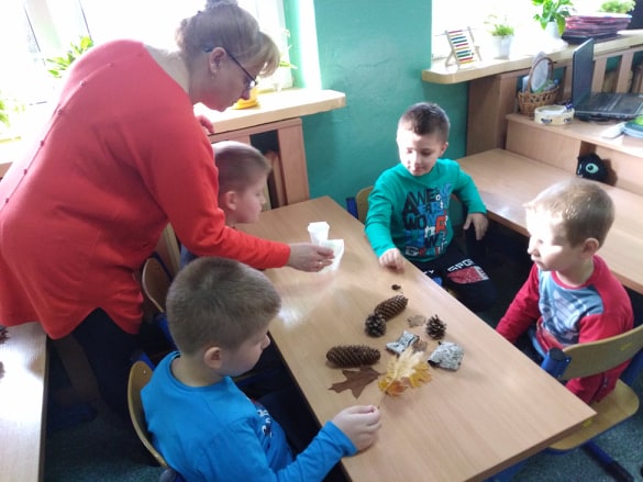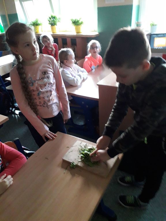 Oprócz ciekawej pogadanki, oglądania prezentacji multimedialnej i pokazie prawdziwych darów lasu, pani leśnik zaproponowała dzieciom przeprowadzenie doświadczenia, które miało rozwiać wszelkie wątpliwości. I tak dzieci kroiły zielone części roślin, umieszczały w roztworze i za pomocą papierka lakmusowego obserwowały efekty.