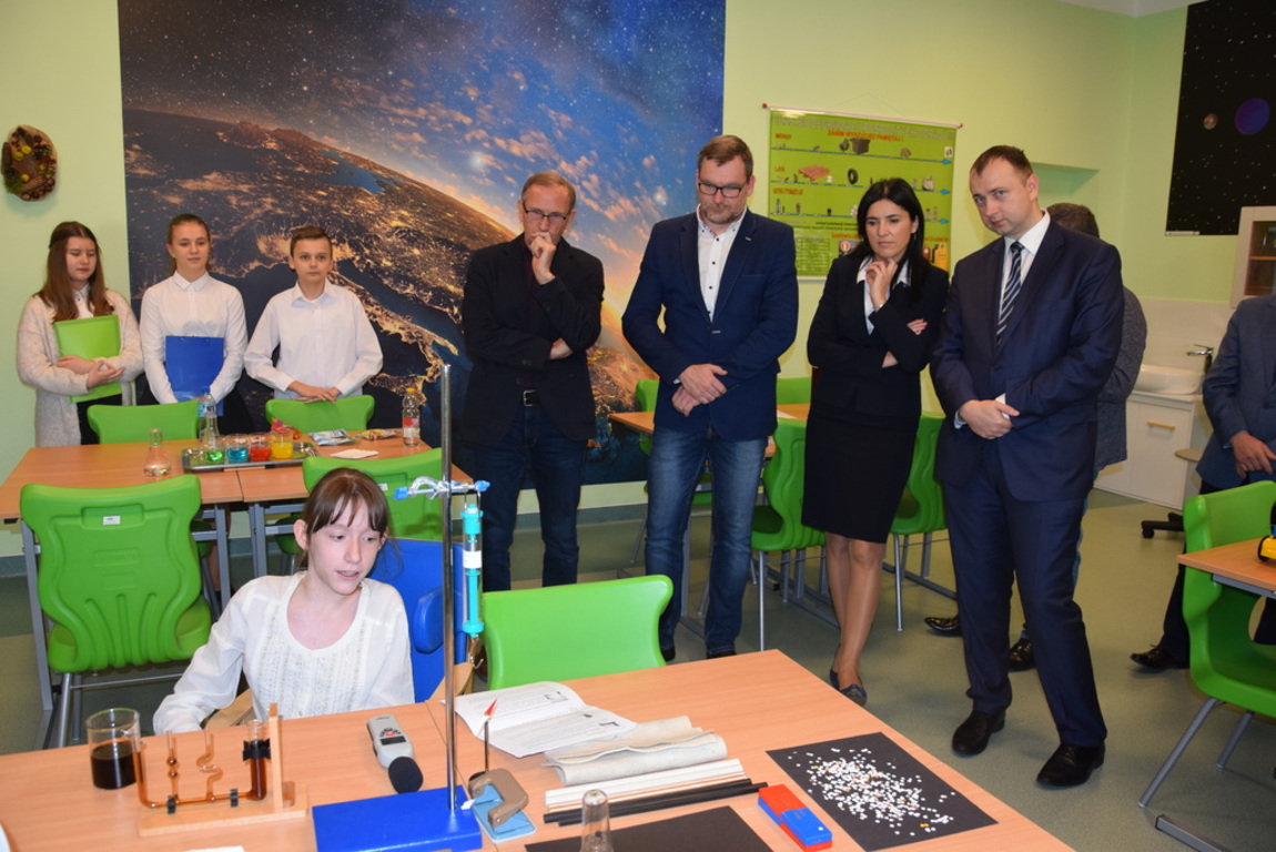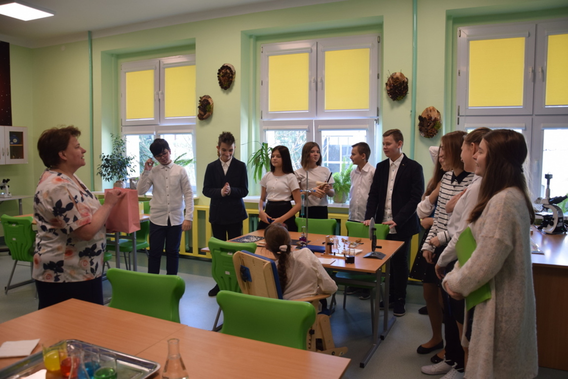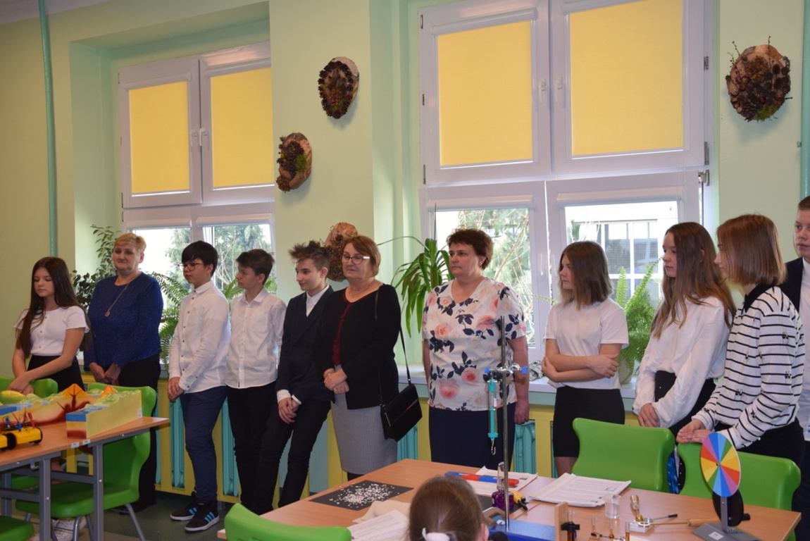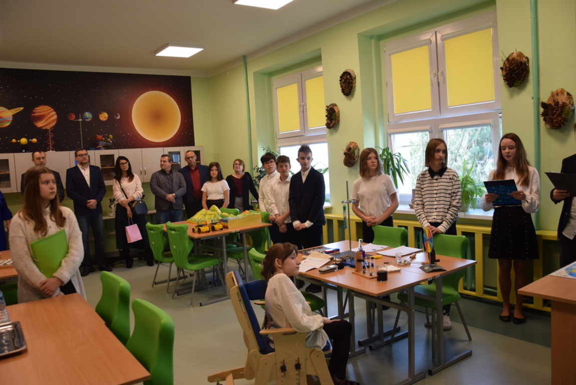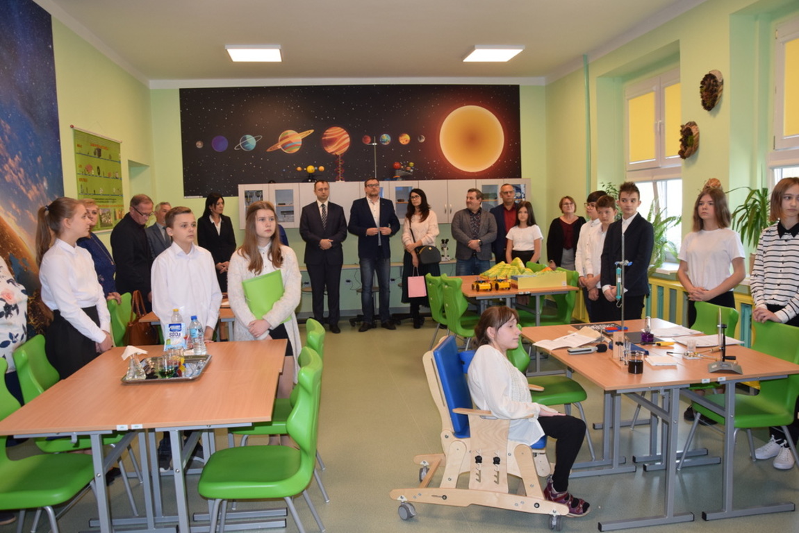 Uczniowie klasy VII przygotowani pod kierunkiem nauczyciela biologii pani Doroty Surmy przedstawili zebranym prezentację multimedialną, która ilustrowała cały proces powstawania nowoczesnej pracowni w szkole. Zgromadzona dokumentacja zdjęciowa była dowodem na wielką metamorfozę sali, jaka dokonała się poprzez uczestnictwo w Konkursie WFOŚiGW w Katowicach. Uczniowie zaprezentowali gościom niektóre z przyrządów i narzędzi stanowiących wyposażenie sali. Wszyscy z wielkim zaciekawieniem przyglądali się wybuchającym, kolorowym wulkanom i doświadczeniom optycznym. Z dziecięcą radością goście obserwowali różne doświadczenia z dziedziny fizyki i chemii.
