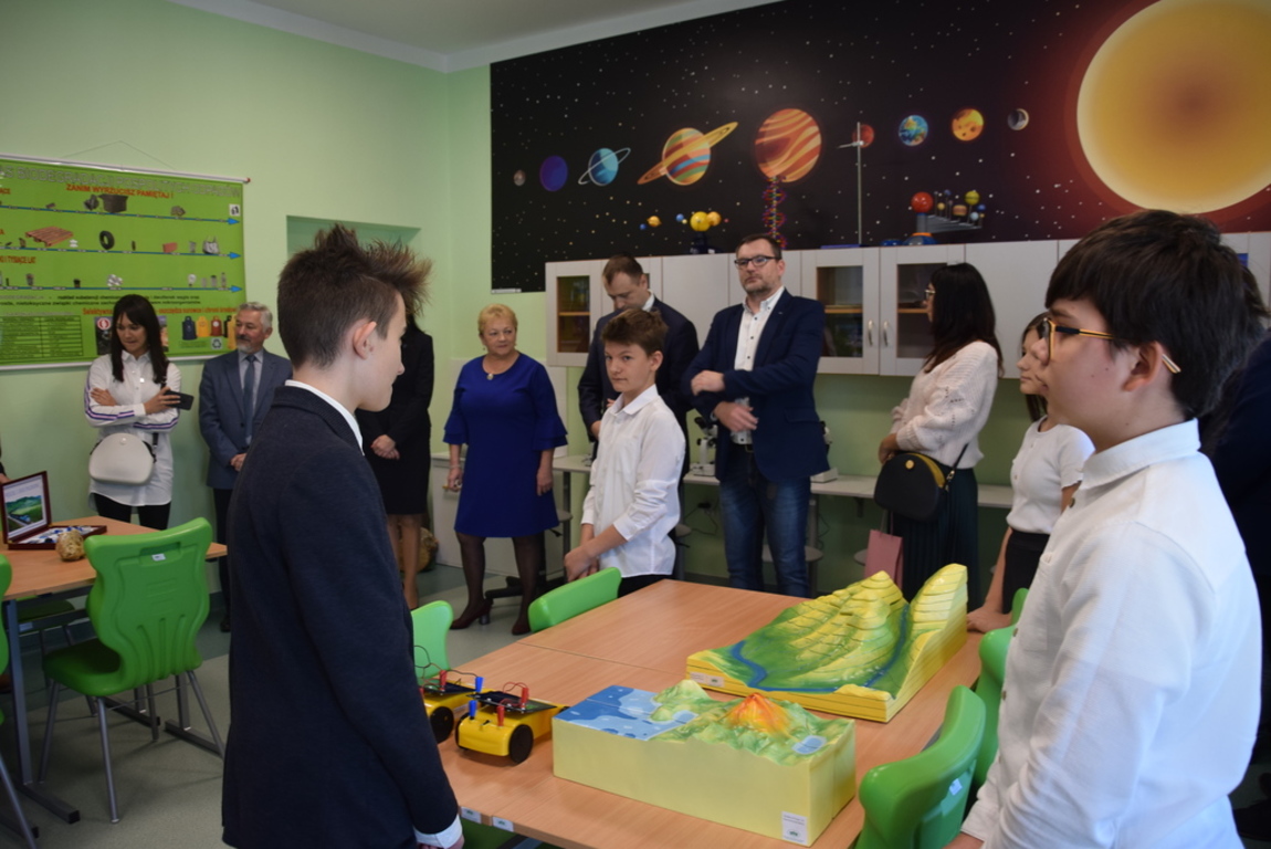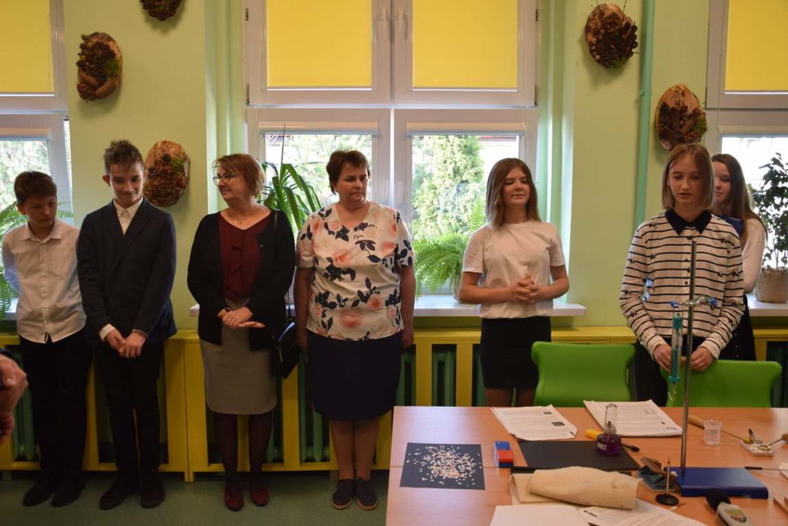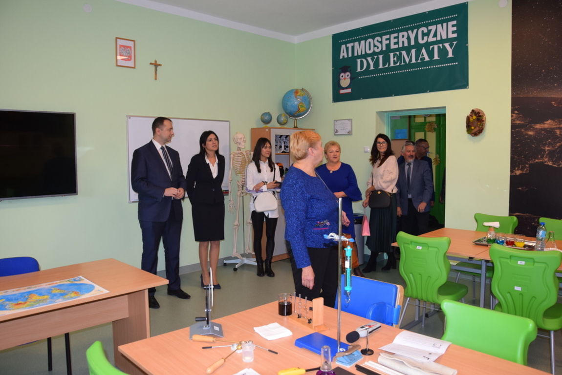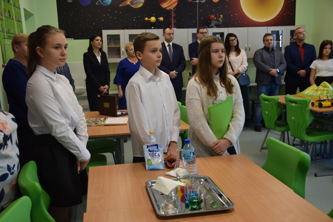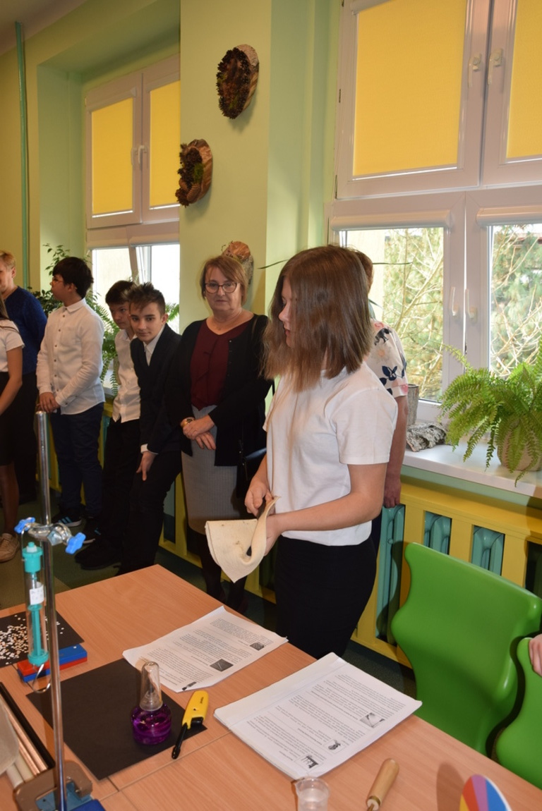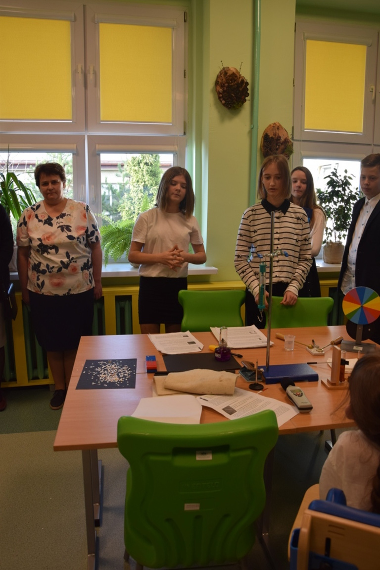 Uczniowie klasy VII przygotowani pod kierunkiem nauczyciela biologii pani Doroty Surmy przedstawili zebranym prezentację multimedialną, która ilustrowała cały proces powstawania nowoczesnej pracowni w szkole. Zgromadzona dokumentacja zdjęciowa była dowodem na wielką metamorfozę sali, jaka dokonała się poprzez uczestnictwo w Konkursie WFOŚiGW w Katowicach. Uczniowie zaprezentowali gościom niektóre z przyrządów i narzędzi stanowiących wyposażenie sali. Wszyscy z wielkim zaciekawieniem przyglądali się wybuchającym, kolorowym wulkanom i doświadczeniom optycznym. Z dziecięcą radością goście obserwowali różne doświadczenia z dziedziny fizyki i chemii.