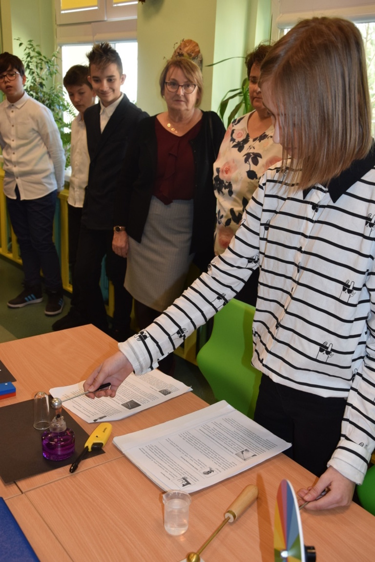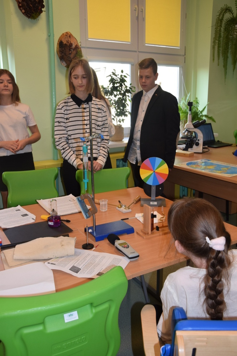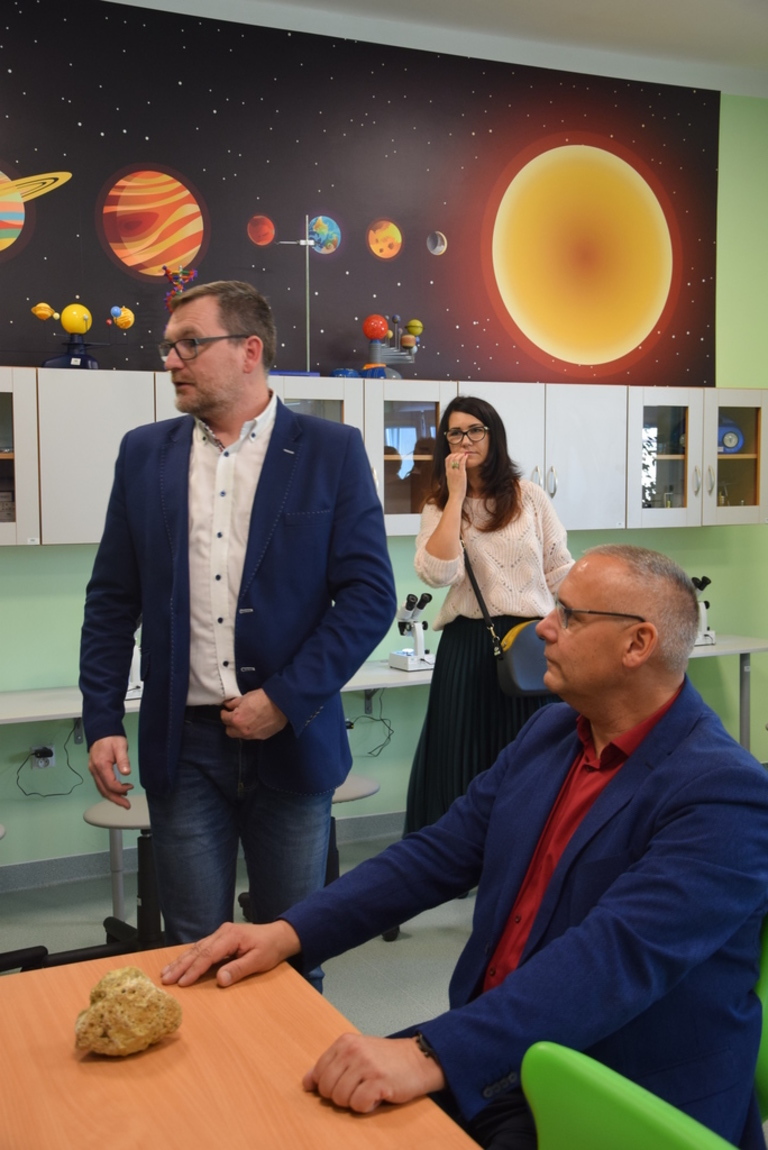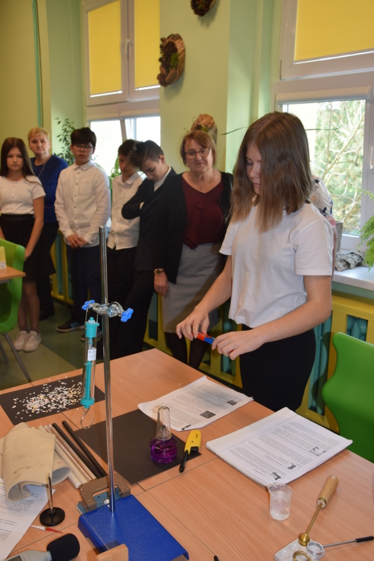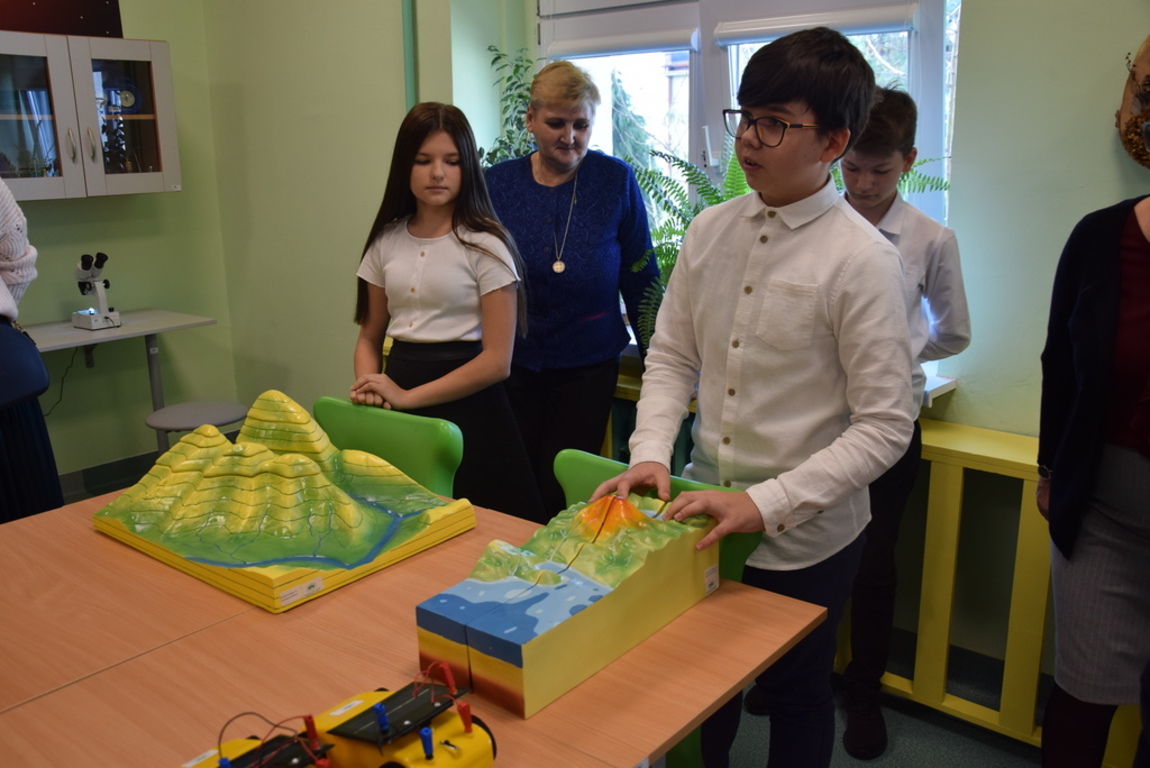 Uczniowie klasy VII przygotowani pod kierunkiem nauczyciela biologii pani Doroty Surmy przedstawili zebranym prezentację multimedialną, która ilustrowała cały proces powstawania nowoczesnej pracowni w szkole. Zgromadzona dokumentacja zdjęciowa była dowodem na wielką metamorfozę sali, jaka dokonała się poprzez uczestnictwo w Konkursie WFOŚiGW w Katowicach. Uczniowie zaprezentowali gościom niektóre z przyrządów i narzędzi stanowiących wyposażenie sali. Wszyscy z wielkim zaciekawieniem przyglądali się wybuchającym, kolorowym wulkanom i doświadczeniom optycznym. Z dziecięcą radością goście obserwowali różne doświadczenia z dziedziny fizyki i chemii.