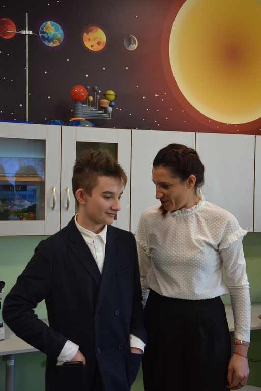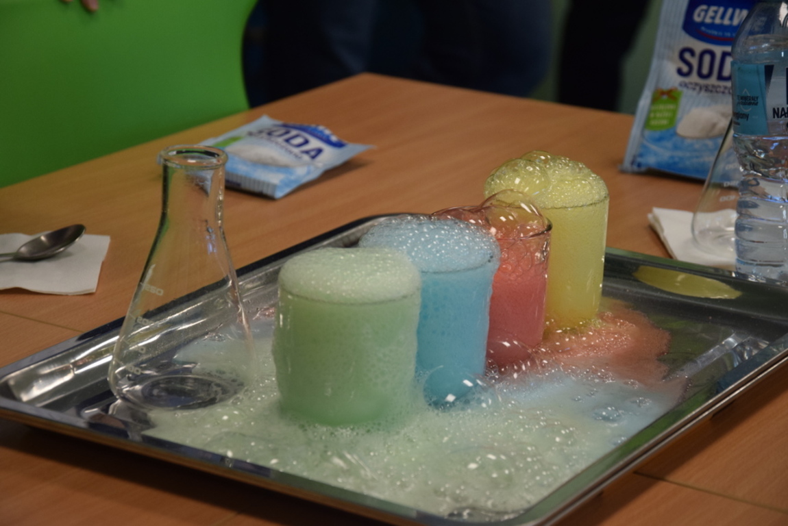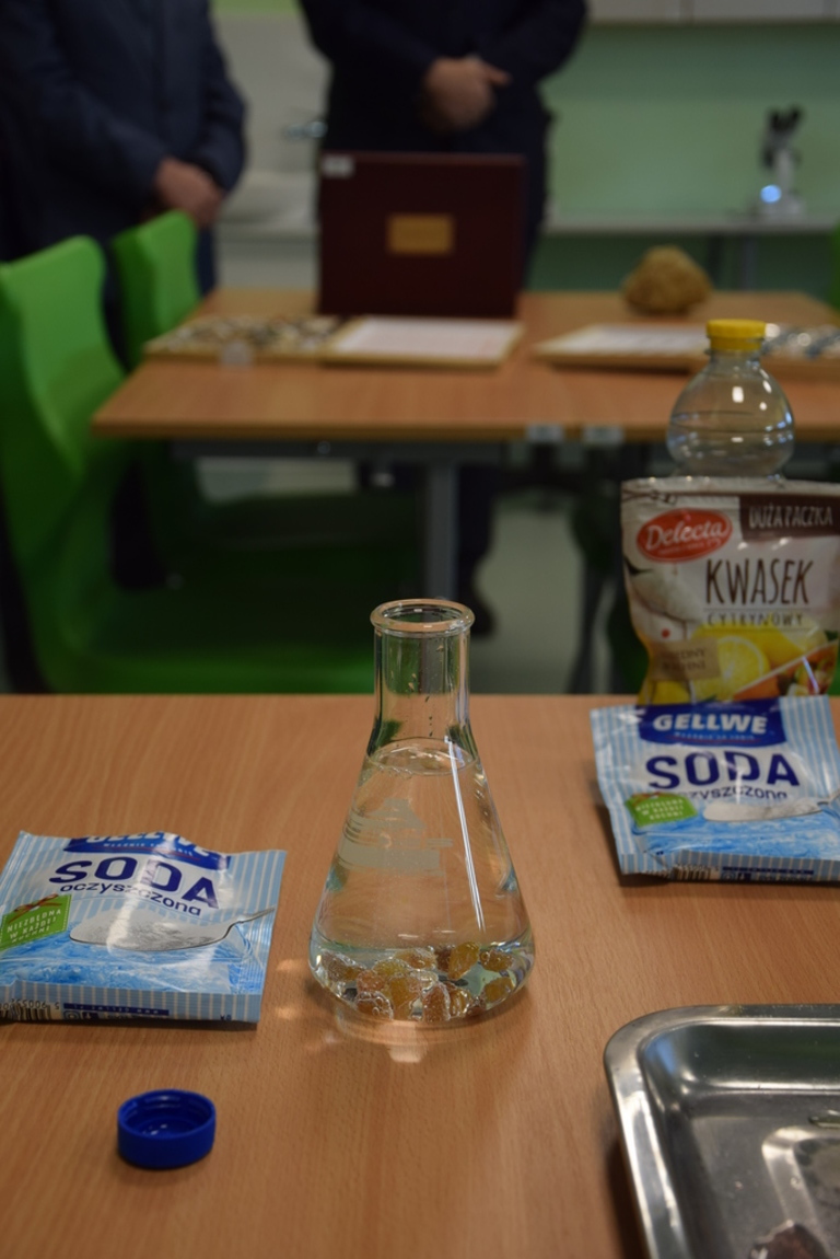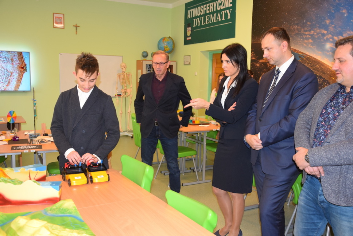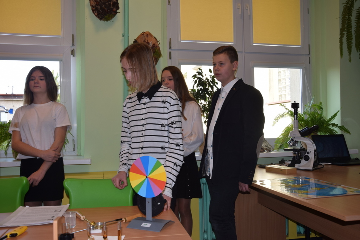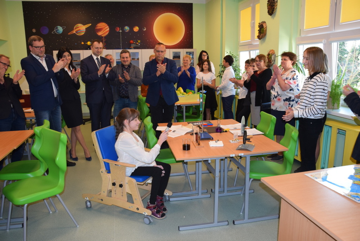 Uczniowie klasy VII przygotowani pod kierunkiem nauczyciela biologii pani Doroty Surmy przedstawili zebranym prezentację multimedialną, która ilustrowała cały proces powstawania nowoczesnej pracowni w szkole. Zgromadzona dokumentacja zdjęciowa była dowodem na wielką metamorfozę sali, jaka dokonała się poprzez uczestnictwo w Konkursie WFOŚiGW w Katowicach. Uczniowie zaprezentowali gościom niektóre z przyrządów i narzędzi stanowiących wyposażenie sali. Wszyscy z wielkim zaciekawieniem przyglądali się wybuchającym, kolorowym wulkanom i doświadczeniom optycznym. Z dziecięcą radością goście obserwowali różne doświadczenia z dziedziny fizyki i chemii.