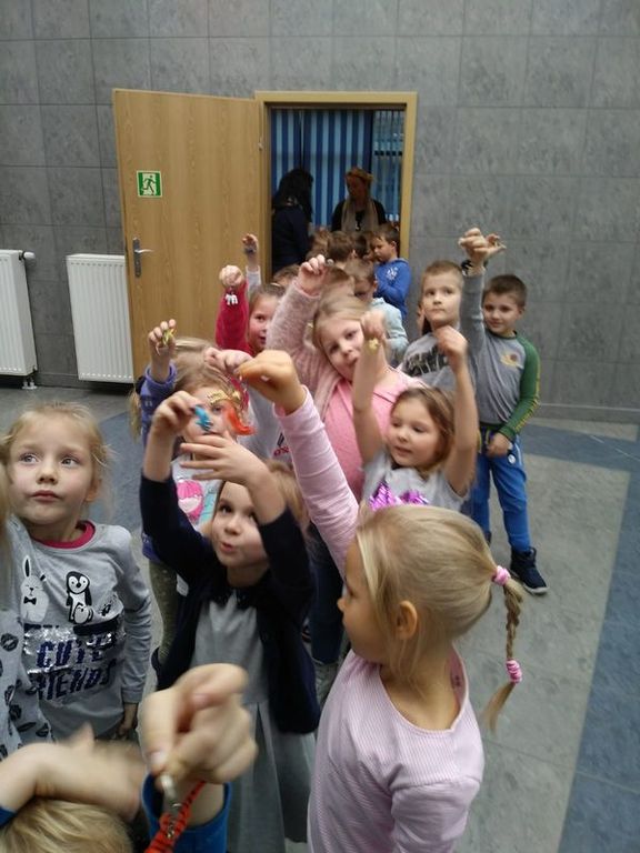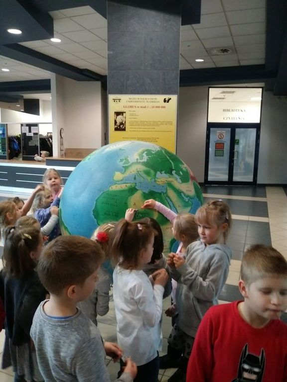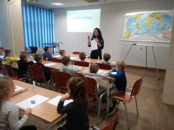 Przedszkolna grupa „Starszaków” w integracji z klasą I wyjechała do Sosnowca na Wydział Nauk o Ziemi na kolejną lekcję muzealną. Tematyką spotkania wykładowo – warsztatowego były rekordy przyrody. Dzieci poszukiwały odpowiedzi na pytania czy rekordy przyrody są stałe i czy szybko ulegają zmianom? Dzieci omawiały z wykładowcą najbardziej popularne rekordy przyrody ożywionej i nieożywionej pracując z mapą świata, mapa plastyczną i mapami konturowymi. Zakończeniem lekcji była karta pracy podsumowująca zdobytą wiedzą. Nagrodą za prawidłowe wykonanie pracy, był pamiątkowe breloczki z wybraną figurką przyrodniczą.