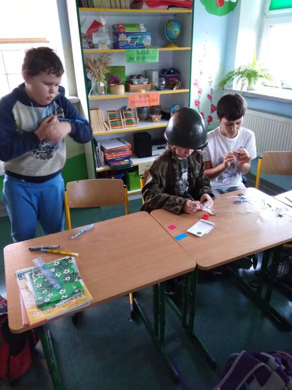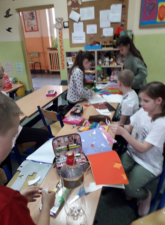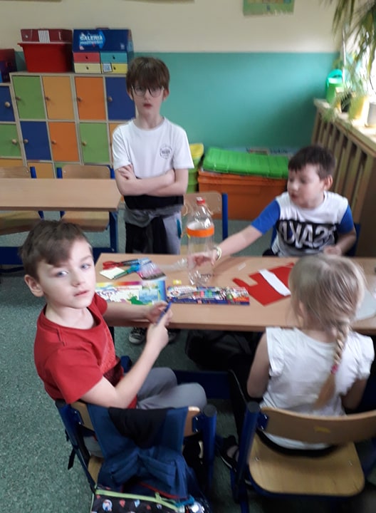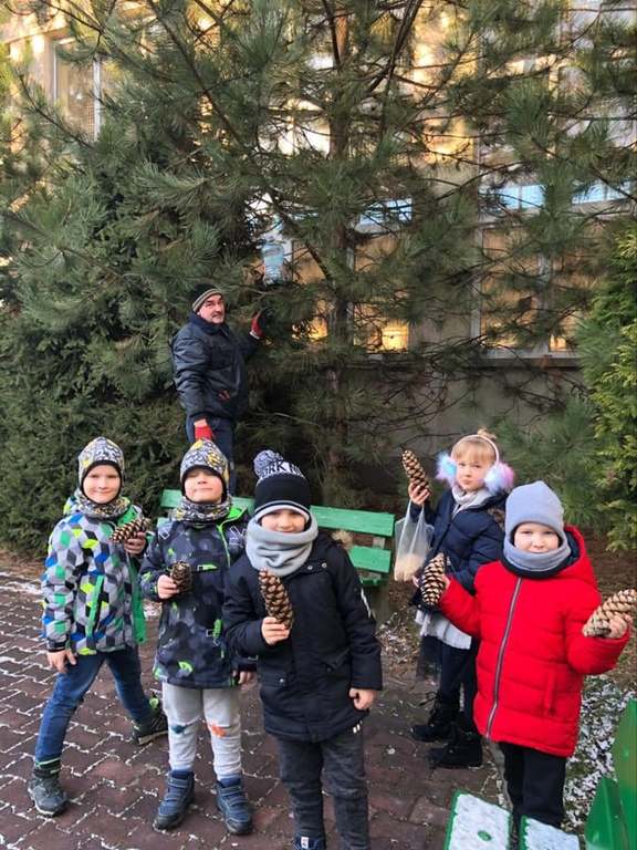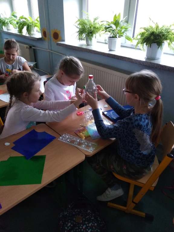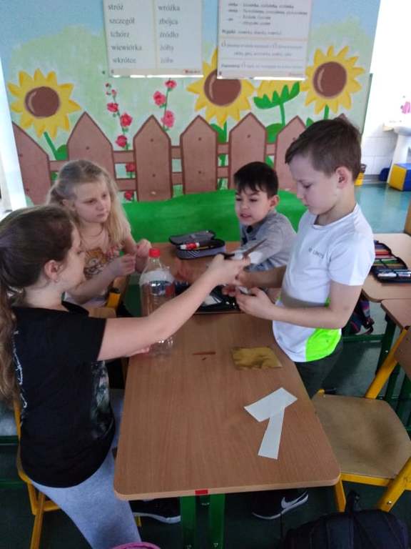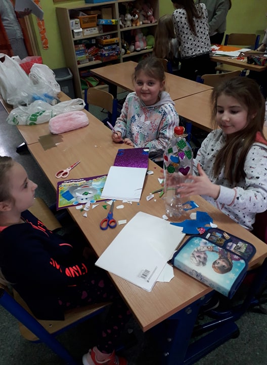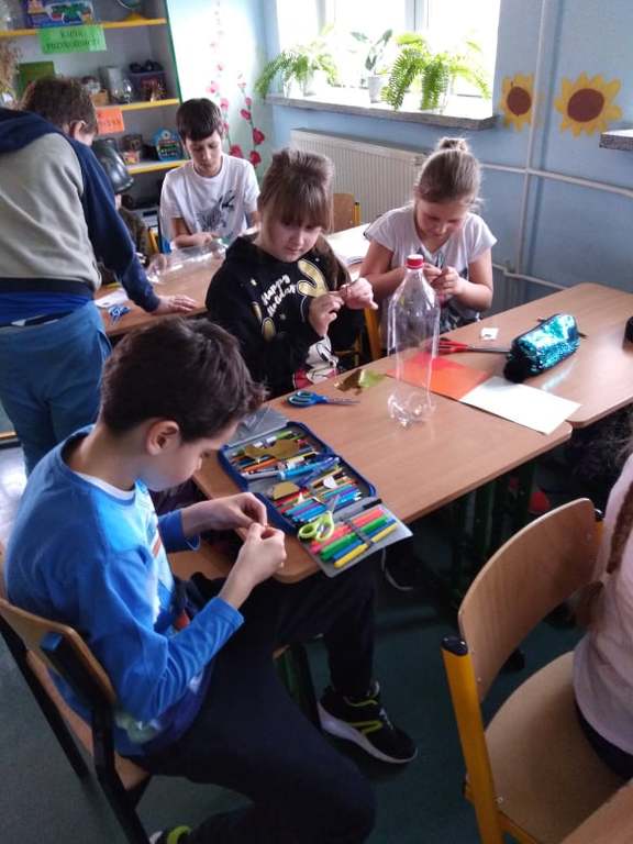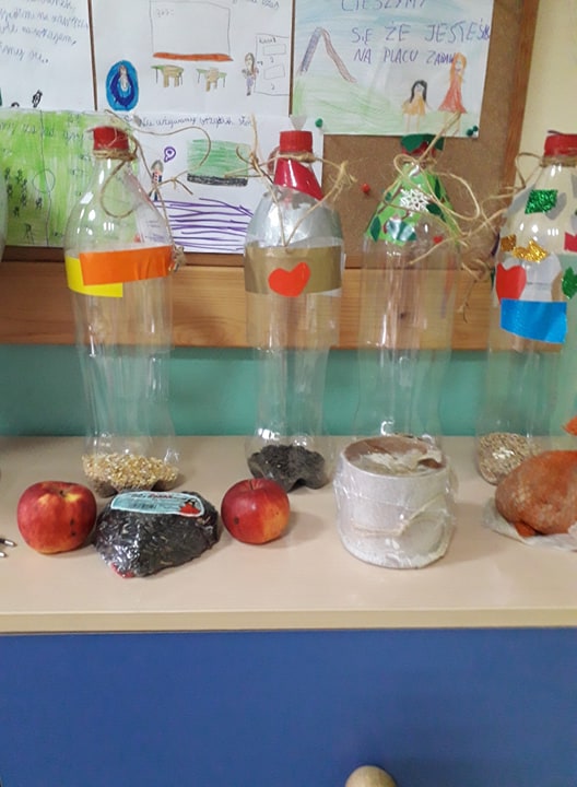 Na koniec zajęć z leśnikiem uczniowie wykonali proste karmniki dla ptaków z materiałów recyklingowych - z butelek plastikowych. Karmniki dla ptaków uzupełnili pokarmem dla ptaków przyniesionym z domów i pokarmem ofiarowanym przez Nadleśnictwo w Świerklańcu. Potem, pełne karmniki zawisły na drzewach w szkolnym ogrodzie.