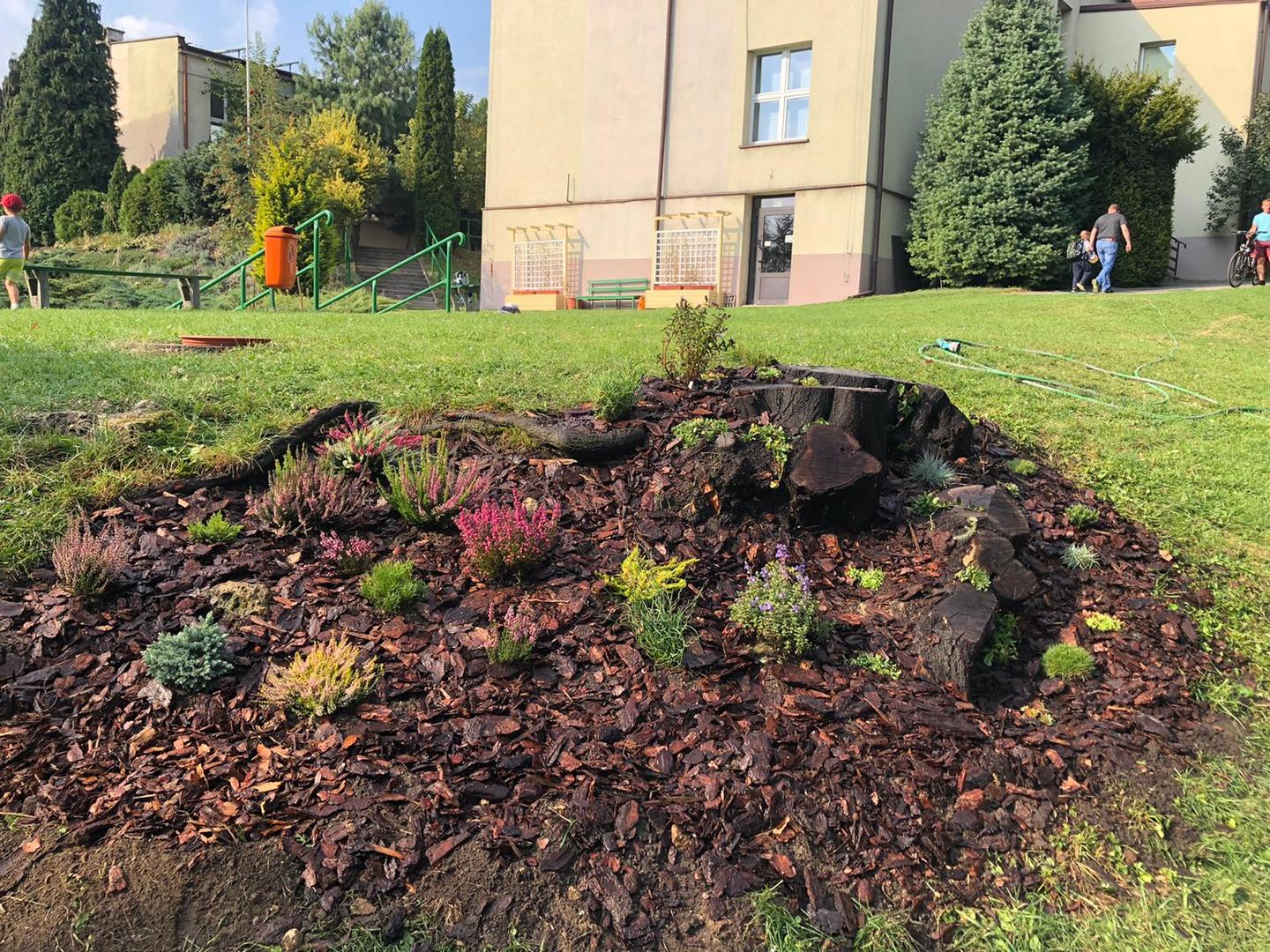 Jako pierwsze zostały wykonane prace ziemne zagospodarowujące przestrzennie ścieżkę sensoryczną, skalniak i klomb kwiatowy. Projekt i prace wykonała Firma Dam – Bud Pana Damiana Hameli ze Sączowa. Dzięki zaangażowaniu rodziców dzieci z grupy Starszaki zostały wykonane nasadzenia roślin w klombie i skalniaku. Dzieci sadziły przyniesione zioła i rośliny skalne. Poznawały ich nazwy, budowę i zapachy.